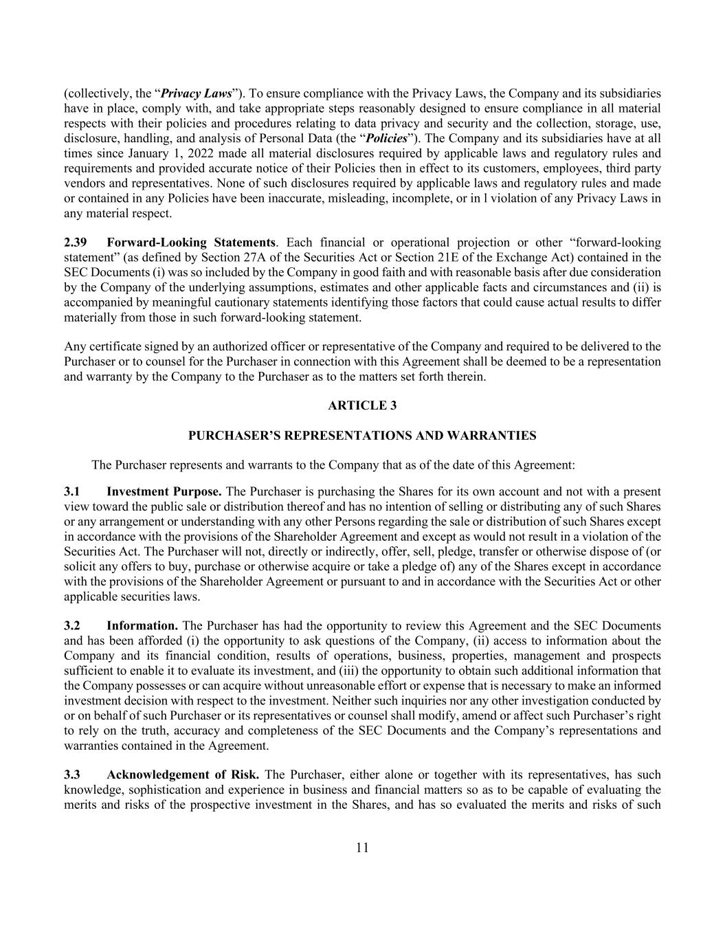 11 (collectively, the “Privacy Laws”). To ensure compliance with the Privacy Laws, the Company and its subsidiaries have in place, comply with, and take appropriate steps reasonably designed to ensure compliance in all material respects with their policies and procedures relating to data privacy and security and the collection, storage, use, disclosure, handling, and analysis of Personal Data (the “Policies”). The Company and its subsidiaries have at all times since January 1, 2022 made all material disclosures required by applicable laws and regulatory rules and requirements and provided accurate notice of their Policies then in effect to its customers, employees, third party vendors and representatives. None of such disclosures required by applicable laws and regulatory rules and made or contained in any Policies have been inaccurate, misleading, incomplete, or in l violation of any Privacy Laws in any material respect. 2.39 Forward-Looking Statements. Each financial or operational projection or other “forward-looking statement” (as defined by Section 27A of the Securities Act or Section 21E of the Exchange Act) contained in the SEC Documents (i) was so included by the Company in good faith and with reasonable basis after due consideration by the Company of the underlying assumptions, estimates and other applicable facts and circumstances and (ii) is accompanied by meaningful cautionary statements identifying those factors that could cause actual results to differ materially from those in such forward-looking statement. Any certificate signed by an authorized officer or representative of the Company and required to be delivered to the Purchaser or to counsel for the Purchaser in connection with this Agreement shall be deemed to be a representation and warranty by the Company to the Purchaser as to the matters set forth therein. ARTICLE 3 PURCHASER’S REPRESENTATIONS AND WARRANTIES The Purchaser represents and warrants to the Company that as of the date of this Agreement: 3.1 Investment Purpose. The Purchaser is purchasing the Shares for its own account and not with a present view toward the public sale or distribution thereof and has no intention of selling or distributing any of such Shares or any arrangement or understanding with any other Persons regarding the sale or distribution of such Shares except in accordance with the provisions of the Shareholder Agreement and except as would not result in a violation of the Securities Act. The Purchaser will not, directly or indirectly, offer, sell, pledge, transfer or otherwise dispose of (or solicit any offers to buy, purchase or otherwise acquire or take a pledge of) any of the Shares except in accordance with the provisions of the Shareholder Agreement or pursuant to and in accordance with the Securities Act or other applicable securities laws. 3.2 Information. The Purchaser has had the opportunity to review this Agreement and the SEC Documents and has been afforded (i) the opportunity to ask questions of the Company, (ii) access to information about the Company and its financial condition, results of operations, business, properties, management and prospects sufficient to enable it to evaluate its investment, and (iii) the opportunity to obtain such additional information that the Company possesses or can acquire without unreasonable effort or expense that is necessary to make an informed investment decision with respect to the investment. Neither such inquiries nor any other investigation conducted by or on behalf of such Purchaser or its representatives or counsel shall modify, amend or affect such Purchaser’s right to rely on the truth, accuracy and completeness of the SEC Documents and the Company’s representations and warranties contained in the Agreement. 3.3 Acknowledgement of Risk. The Purchaser, either alone or together with its representatives, has such knowledge, sophistication and experience in business and financial matters so as to be capable of evaluating the merits and risks of the prospective investment in the Shares, and has so evaluated the merits and risks of such