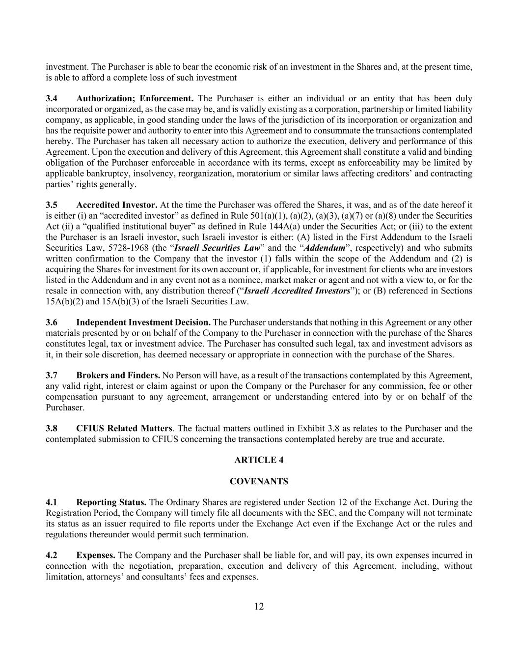 12 investment. The Purchaser is able to bear the economic risk of an investment in the Shares and, at the present time, is able to afford a complete loss of such investment 3.4 Authorization; Enforcement. The Purchaser is either an individual or an entity that has been duly incorporated or organized, as the case may be, and is validly existing as a corporation, partnership or limited liability company, as applicable, in good standing under the laws of the jurisdiction of its incorporation or organization and has the requisite power and authority to enter into this Agreement and to consummate the transactions contemplated hereby. The Purchaser has taken all necessary action to authorize the execution, delivery and performance of this Agreement. Upon the execution and delivery of this Agreement, this Agreement shall constitute a valid and binding obligation of the Purchaser enforceable in accordance with its terms, except as enforceability may be limited by applicable bankruptcy, insolvency, reorganization, moratorium or similar laws affecting creditors’ and contracting parties’ rights generally. 3.5 Accredited Investor. At the time the Purchaser was offered the Shares, it was, and as of the date hereof it is either (i) an “accredited investor” as defined in Rule 501(a)(1), (a)(2), (a)(3), (a)(7) or (a)(8) under the Securities Act (ii) a “qualified institutional buyer” as defined in Rule 144A(a) under the Securities Act; or (iii) to the extent the Purchaser is an Israeli investor, such Israeli investor is either: (A) listed in the First Addendum to the Israeli Securities Law, 5728-1968 (the “Israeli Securities Law” and the “Addendum”, respectively) and who submits written confirmation to the Company that the investor (1) falls within the scope of the Addendum and (2) is acquiring the Shares for investment for its own account or, if applicable, for investment for clients who are investors listed in the Addendum and in any event not as a nominee, market maker or agent and not with a view to, or for the resale in connection with, any distribution thereof (“Israeli Accredited Investors”); or (B) referenced in Sections 15A(b)(2) and 15A(b)(3) of the Israeli Securities Law. 3.6 Independent Investment Decision. The Purchaser understands that nothing in this Agreement or any other materials presented by or on behalf of the Company to the Purchaser in connection with the purchase of the Shares constitutes legal, tax or investment advice. The Purchaser has consulted such legal, tax and investment advisors as it, in their sole discretion, has deemed necessary or appropriate in connection with the purchase of the Shares. 3.7 Brokers and Finders. No Person will have, as a result of the transactions contemplated by this Agreement, any valid right, interest or claim against or upon the Company or the Purchaser for any commission, fee or other compensation pursuant to any agreement, arrangement or understanding entered into by or on behalf of the Purchaser. 3.8 CFIUS Related Matters. The factual matters outlined in Exhibit 3.8 as relates to the Purchaser and the contemplated submission to CFIUS concerning the transactions contemplated hereby are true and accurate. ARTICLE 4 COVENANTS 4.1 Reporting Status. The Ordinary Shares are registered under Section 12 of the Exchange Act. During the Registration Period, the Company will timely file all documents with the SEC, and the Company will not terminate its status as an issuer required to file reports under the Exchange Act even if the Exchange Act or the rules and regulations thereunder would permit such termination. 4.2 Expenses. The Company and the Purchaser shall be liable for, and will pay, its own expenses incurred in connection with the negotiation, preparation, execution and delivery of this Agreement, including, without limitation, attorneys’ and consultants’ fees and expenses.