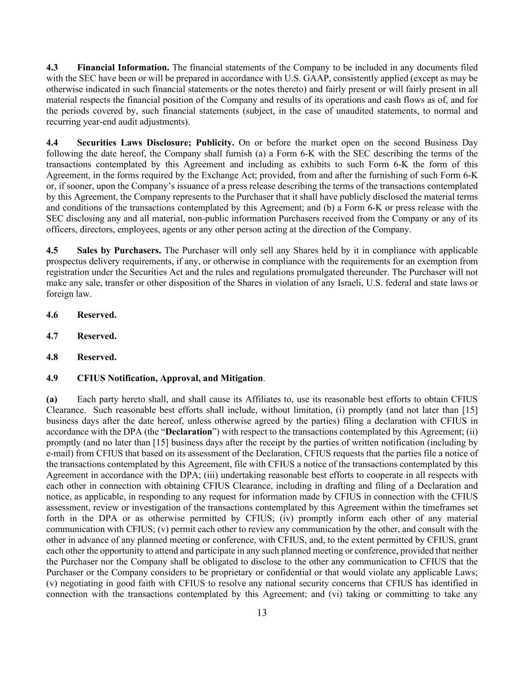 13 4.3 Financial Information. The financial statements of the Company to be included in any documents filed with the SEC have been or will be prepared in accordance with U.S. GAAP, consistently applied (except as may be otherwise indicated in such financial statements or the notes thereto) and fairly present or will fairly present in all material respects the financial position of the Company and results of its operations and cash flows as of, and for the periods covered by, such financial statements (subject, in the case of unaudited statements, to normal and recurring year-end audit adjustments). 4.4 Securities Laws Disclosure; Publicity. On or before the market open on the second Business Day following the date hereof, the Company shall furnish (a) a Form 6-K with the SEC describing the terms of the transactions contemplated by this Agreement and including as exhibits to such Form 6-K the form of this Agreement, in the forms required by the Exchange Act; provided, from and after the furnishing of such Form 6-K or, if sooner, upon the Company’s issuance of a press release describing the terms of the transactions contemplated by this Agreement, the Company represents to the Purchaser that it shall have publicly disclosed the material terms and conditions of the transactions contemplated by this Agreement; and (b) a Form 6-K or press release with the SEC disclosing any and all material, non-public information Purchasers received from the Company or any of its officers, directors, employees, agents or any other person acting at the direction of the Company. 4.5 Sales by Purchasers. The Purchaser will only sell any Shares held by it in compliance with applicable prospectus delivery requirements, if any, or otherwise in compliance with the requirements for an exemption from registration under the Securities Act and the rules and regulations promulgated thereunder. The Purchaser will not make any sale, transfer or other disposition of the Shares in violation of any Israeli, U.S. federal and state laws or foreign law. 4.6 Reserved. 4.7 Reserved. 4.8 Reserved. 4.9 CFIUS Notification, Approval, and Mitigation. (a) Each party hereto shall, and shall cause its Affiliates to, use its reasonable best efforts to obtain CFIUS Clearance. Such reasonable best efforts shall include, without limitation, (i) promptly (and not later than [15] business days after the date hereof, unless otherwise agreed by the parties) filing a declaration with CFIUS in accordance with the DPA (the “Declaration”) with respect to the transactions contemplated by this Agreement; (ii) promptly (and no later than [15] business days after the receipt by the parties of written notification (including by e-mail) from CFIUS that based on its assessment of the Declaration, CFIUS requests that the parties file a notice of the transactions contemplated by this Agreement, file with CFIUS a notice of the transactions contemplated by this Agreement in accordance with the DPA; (iii) undertaking reasonable best efforts to cooperate in all respects with each other in connection with obtaining CFIUS Clearance, including in drafting and filing of a Declaration and notice, as applicable, in responding to any request for information made by CFIUS in connection with the CFIUS assessment, review or investigation of the transactions contemplated by this Agreement within the timeframes set forth in the DPA or as otherwise permitted by CFIUS; (iv) promptly inform each other of any material communication with CFIUS; (v) permit each other to review any communication by the other, and consult with the other in advance of any planned meeting or conference, with CFIUS, and, to the extent permitted by CFIUS, grant each other the opportunity to attend and participate in any such planned meeting or conference, provided that neither the Purchaser nor the Company shall be obligated to disclose to the other any communication to CFIUS that the Purchaser or the Company considers to be proprietary or confidential or that would violate any applicable Laws; (v) negotiating in good faith with CFIUS to resolve any national security concerns that CFIUS has identified in connection with the transactions contemplated by this Agreement; and (vi) taking or committing to take any