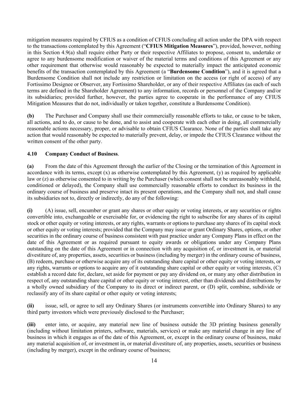 14 mitigation measures required by CFIUS as a condition of CFIUS concluding all action under the DPA with respect to the transactions contemplated by this Agreement (“CFIUS Mitigation Measures”), provided, however, nothing in this Section 4.9(a) shall require either Party or their respective Affiliates to propose, consent to, undertake or agree to any burdensome modification or waiver of the material terms and conditions of this Agreement or any other requirement that otherwise would reasonably be expected to materially impact the anticipated economic benefits of the transaction contemplated by this Agreement (a “Burdensome Condition”), and it is agreed that a Burdensome Condition shall not include any restriction or limitation on the access (or right of access) of any Fortissimo Designee or Observer, any Fortissimo Shareholder, or any of their respective Affiliates (as each of such terms are defined in the Shareholder Agreement) to any information, records or personnel of the Company and/or its subsidiaries; provided further, however, the parties agree to cooperate in the performance of any CFIUS Mitigation Measures that do not, individually or taken together, constitute a Burdensome Condition). (b) The Purchaser and Company shall use their commercially reasonable efforts to take, or cause to be taken, all actions, and to do, or cause to be done, and to assist and cooperate with each other in doing, all commercially reasonable actions necessary, proper, or advisable to obtain CFIUS Clearance. None of the parties shall take any action that would reasonably be expected to materially prevent, delay, or impede the CFIUS Clearance without the written consent of the other party. 4.10 Company Conduct of Business. (a) From the date of this Agreement through the earlier of the Closing or the termination of this Agreement in accordance with its terms, except (x) as otherwise contemplated by this Agreement, (y) as required by applicable law or (z) as otherwise consented to in writing by the Purchaser (which consent shall not be unreasonably withheld, conditioned or delayed), the Company shall use commercially reasonable efforts to conduct its business in the ordinary course of business and preserve intact its present operations, and the Company shall not, and shall cause its subsidiaries not to, directly or indirectly, do any of the following: (i) (A) issue, sell, encumber or grant any shares or other equity or voting interests, or any securities or rights convertible into, exchangeable or exercisable for, or evidencing the right to subscribe for any shares of its capital stock or other equity or voting interests, or any rights, warrants or options to purchase any shares of its capital stock or other equity or voting interests; provided that the Company may issue or grant Ordinary Shares, options, or other securities in the ordinary course of business consistent with past practice under any Company Plans in effect on the date of this Agreement or as required pursuant to equity awards or obligations under any Company Plans outstanding on the date of this Agreement or in connection with any acquisition of, or investment in, or material divestiture of, any properties, assets, securities or business (including by merger) in the ordinary course of business, (B) redeem, purchase or otherwise acquire any of its outstanding share capital or other equity or voting interests, or any rights, warrants or options to acquire any of it outstanding share capital or other equity or voting interests, (C) establish a record date for, declare, set aside for payment or pay any dividend on, or many any other distribution in respect of, any outstanding share capital or other equity or voting interest, other than dividends and distributions by a wholly owned subsidiary of the Company to its direct or indirect parent, or (D) split, combine, subdivide or reclassify any of its share capital or other equity or voting interests; (ii) issue, sell, or agree to sell any Ordinary Shares (or instruments convertible into Ordinary Shares) to any third party investors which were previously disclosed to the Purchaser; (iii) enter into, or acquire, any material new line of business outside the 3D printing business generally (including without limitation printers, software, materials, services) or make any material change in any line of business in which it engages as of the date of this Agreement, or, except in the ordinary course of business, make any material acquisition of, or investment in, or material divestiture of, any properties, assets, securities or business (including by merger), except in the ordinary course of business;
