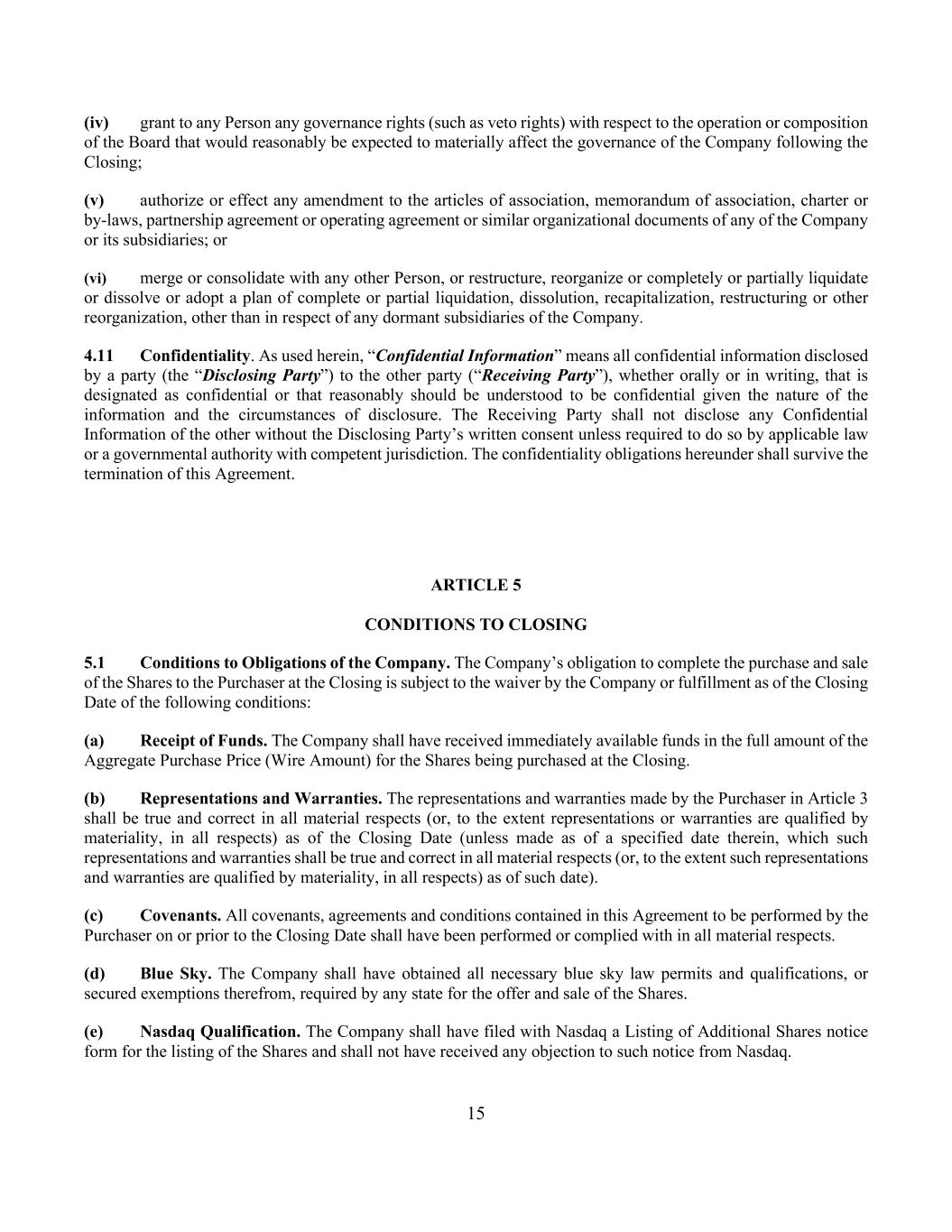 15 (iv) grant to any Person any governance rights (such as veto rights) with respect to the operation or composition of the Board that would reasonably be expected to materially affect the governance of the Company following the Closing; (v) authorize or effect any amendment to the articles of association, memorandum of association, charter or by-laws, partnership agreement or operating agreement or similar organizational documents of any of the Company or its subsidiaries; or (vi) merge or consolidate with any other Person, or restructure, reorganize or completely or partially liquidate or dissolve or adopt a plan of complete or partial liquidation, dissolution, recapitalization, restructuring or other reorganization, other than in respect of any dormant subsidiaries of the Company. 4.11 Confidentiality. As used herein, “Confidential Information” means all confidential information disclosed by a party (the “Disclosing Party”) to the other party (“Receiving Party”), whether orally or in writing, that is designated as confidential or that reasonably should be understood to be confidential given the nature of the information and the circumstances of disclosure. The Receiving Party shall not disclose any Confidential Information of the other without the Disclosing Party’s written consent unless required to do so by applicable law or a governmental authority with competent jurisdiction. The confidentiality obligations hereunder shall survive the termination of this Agreement. ARTICLE 5 CONDITIONS TO CLOSING 5.1 Conditions to Obligations of the Company. The Company’s obligation to complete the purchase and sale of the Shares to the Purchaser at the Closing is subject to the waiver by the Company or fulfillment as of the Closing Date of the following conditions: (a) Receipt of Funds. The Company shall have received immediately available funds in the full amount of the Aggregate Purchase Price (Wire Amount) for the Shares being purchased at the Closing. (b) Representations and Warranties. The representations and warranties made by the Purchaser in Article 3 shall be true and correct in all material respects (or, to the extent representations or warranties are qualified by materiality, in all respects) as of the Closing Date (unless made as of a specified date therein, which such representations and warranties shall be true and correct in all material respects (or, to the extent such representations and warranties are qualified by materiality, in all respects) as of such date). (c) Covenants. All covenants, agreements and conditions contained in this Agreement to be performed by the Purchaser on or prior to the Closing Date shall have been performed or complied with in all material respects. (d) Blue Sky. The Company shall have obtained all necessary blue sky law permits and qualifications, or secured exemptions therefrom, required by any state for the offer and sale of the Shares. (e) Nasdaq Qualification. The Company shall have filed with Nasdaq a Listing of Additional Shares notice form for the listing of the Shares and shall not have received any objection to such notice from Nasdaq.