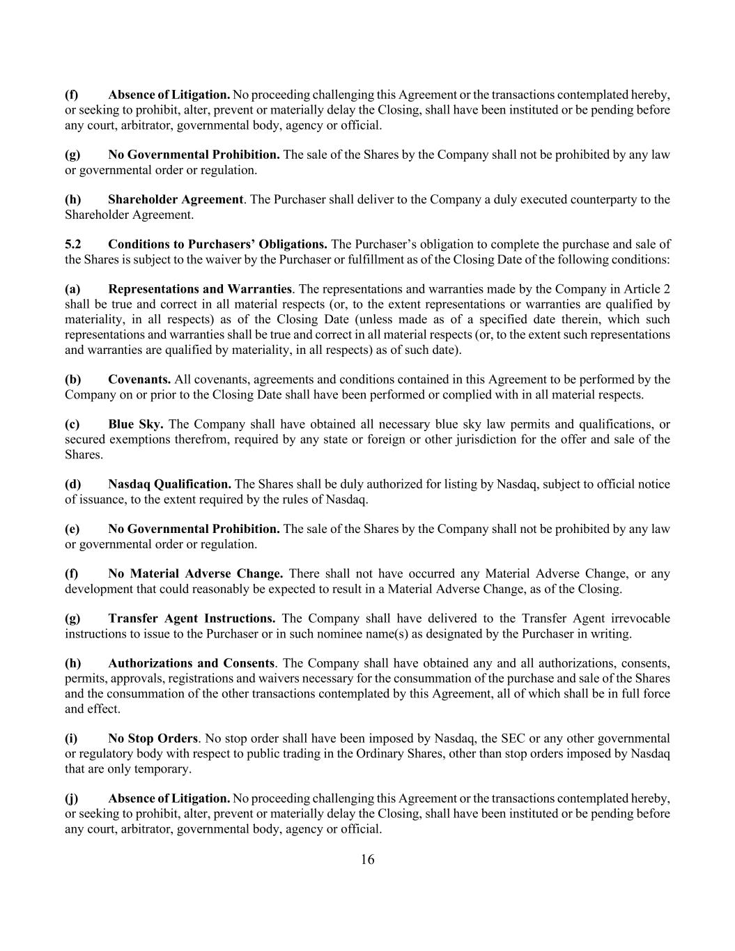 16 (f) Absence of Litigation. No proceeding challenging this Agreement or the transactions contemplated hereby, or seeking to prohibit, alter, prevent or materially delay the Closing, shall have been instituted or be pending before any court, arbitrator, governmental body, agency or official. (g) No Governmental Prohibition. The sale of the Shares by the Company shall not be prohibited by any law or governmental order or regulation. (h) Shareholder Agreement. The Purchaser shall deliver to the Company a duly executed counterparty to the Shareholder Agreement. 5.2 Conditions to Purchasers’ Obligations. The Purchaser’s obligation to complete the purchase and sale of the Shares is subject to the waiver by the Purchaser or fulfillment as of the Closing Date of the following conditions: (a) Representations and Warranties. The representations and warranties made by the Company in Article 2 shall be true and correct in all material respects (or, to the extent representations or warranties are qualified by materiality, in all respects) as of the Closing Date (unless made as of a specified date therein, which such representations and warranties shall be true and correct in all material respects (or, to the extent such representations and warranties are qualified by materiality, in all respects) as of such date). (b) Covenants. All covenants, agreements and conditions contained in this Agreement to be performed by the Company on or prior to the Closing Date shall have been performed or complied with in all material respects. (c) Blue Sky. The Company shall have obtained all necessary blue sky law permits and qualifications, or secured exemptions therefrom, required by any state or foreign or other jurisdiction for the offer and sale of the Shares. (d) Nasdaq Qualification. The Shares shall be duly authorized for listing by Nasdaq, subject to official notice of issuance, to the extent required by the rules of Nasdaq. (e) No Governmental Prohibition. The sale of the Shares by the Company shall not be prohibited by any law or governmental order or regulation. (f) No Material Adverse Change. There shall not have occurred any Material Adverse Change, or any development that could reasonably be expected to result in a Material Adverse Change, as of the Closing. (g) Transfer Agent Instructions. The Company shall have delivered to the Transfer Agent irrevocable instructions to issue to the Purchaser or in such nominee name(s) as designated by the Purchaser in writing. (h) Authorizations and Consents. The Company shall have obtained any and all authorizations, consents, permits, approvals, registrations and waivers necessary for the consummation of the purchase and sale of the Shares and the consummation of the other transactions contemplated by this Agreement, all of which shall be in full force and effect. (i) No Stop Orders. No stop order shall have been imposed by Nasdaq, the SEC or any other governmental or regulatory body with respect to public trading in the Ordinary Shares, other than stop orders imposed by Nasdaq that are only temporary. (j) Absence of Litigation. No proceeding challenging this Agreement or the transactions contemplated hereby, or seeking to prohibit, alter, prevent or materially delay the Closing, shall have been instituted or be pending before any court, arbitrator, governmental body, agency or official.