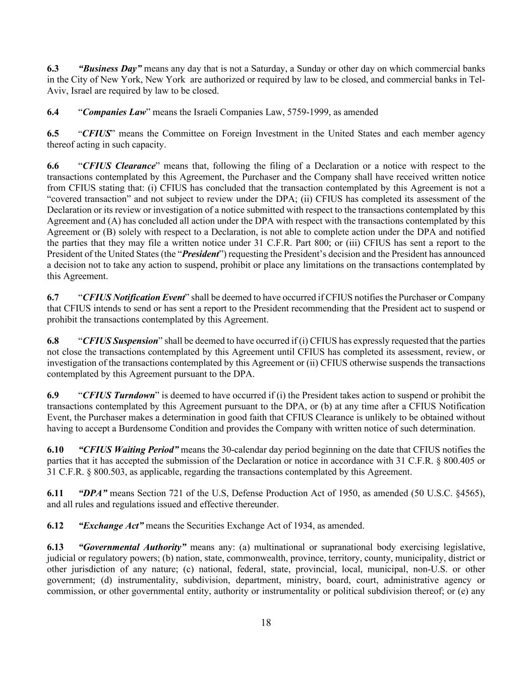 18 6.3 “Business Day” means any day that is not a Saturday, a Sunday or other day on which commercial banks in the City of New York, New York are authorized or required by law to be closed, and commercial banks in Tel- Aviv, Israel are required by law to be closed. 6.4 “Companies Law” means the Israeli Companies Law, 5759-1999, as amended 6.5 “CFIUS” means the Committee on Foreign Investment in the United States and each member agency thereof acting in such capacity. 6.6 “CFIUS Clearance” means that, following the filing of a Declaration or a notice with respect to the transactions contemplated by this Agreement, the Purchaser and the Company shall have received written notice from CFIUS stating that: (i) CFIUS has concluded that the transaction contemplated by this Agreement is not a “covered transaction” and not subject to review under the DPA; (ii) CFIUS has completed its assessment of the Declaration or its review or investigation of a notice submitted with respect to the transactions contemplated by this Agreement and (A) has concluded all action under the DPA with respect with the transactions contemplated by this Agreement or (B) solely with respect to a Declaration, is not able to complete action under the DPA and notified the parties that they may file a written notice under 31 C.F.R. Part 800; or (iii) CFIUS has sent a report to the President of the United States (the “President”) requesting the President’s decision and the President has announced a decision not to take any action to suspend, prohibit or place any limitations on the transactions contemplated by this Agreement. 6.7 “CFIUS Notification Event” shall be deemed to have occurred if CFIUS notifies the Purchaser or Company that CFIUS intends to send or has sent a report to the President recommending that the President act to suspend or prohibit the transactions contemplated by this Agreement. 6.8 “CFIUS Suspension” shall be deemed to have occurred if (i) CFIUS has expressly requested that the parties not close the transactions contemplated by this Agreement until CFIUS has completed its assessment, review, or investigation of the transactions contemplated by this Agreement or (ii) CFIUS otherwise suspends the transactions contemplated by this Agreement pursuant to the DPA. 6.9 “CFIUS Turndown” is deemed to have occurred if (i) the President takes action to suspend or prohibit the transactions contemplated by this Agreement pursuant to the DPA, or (b) at any time after a CFIUS Notification Event, the Purchaser makes a determination in good faith that CFIUS Clearance is unlikely to be obtained without having to accept a Burdensome Condition and provides the Company with written notice of such determination. 6.10 “CFIUS Waiting Period” means the 30-calendar day period beginning on the date that CFIUS notifies the parties that it has accepted the submission of the Declaration or notice in accordance with 31 C.F.R. § 800.405 or 31 C.F.R. § 800.503, as applicable, regarding the transactions contemplated by this Agreement. 6.11 “DPA” means Section 721 of the U.S, Defense Production Act of 1950, as amended (50 U.S.C. §4565), and all rules and regulations issued and effective thereunder. 6.12 “Exchange Act” means the Securities Exchange Act of 1934, as amended. 6.13 “Governmental Authority” means any: (a) multinational or supranational body exercising legislative, judicial or regulatory powers; (b) nation, state, commonwealth, province, territory, county, municipality, district or other jurisdiction of any nature; (c) national, federal, state, provincial, local, municipal, non-U.S. or other government; (d) instrumentality, subdivision, department, ministry, board, court, administrative agency or commission, or other governmental entity, authority or instrumentality or political subdivision thereof; or (e) any