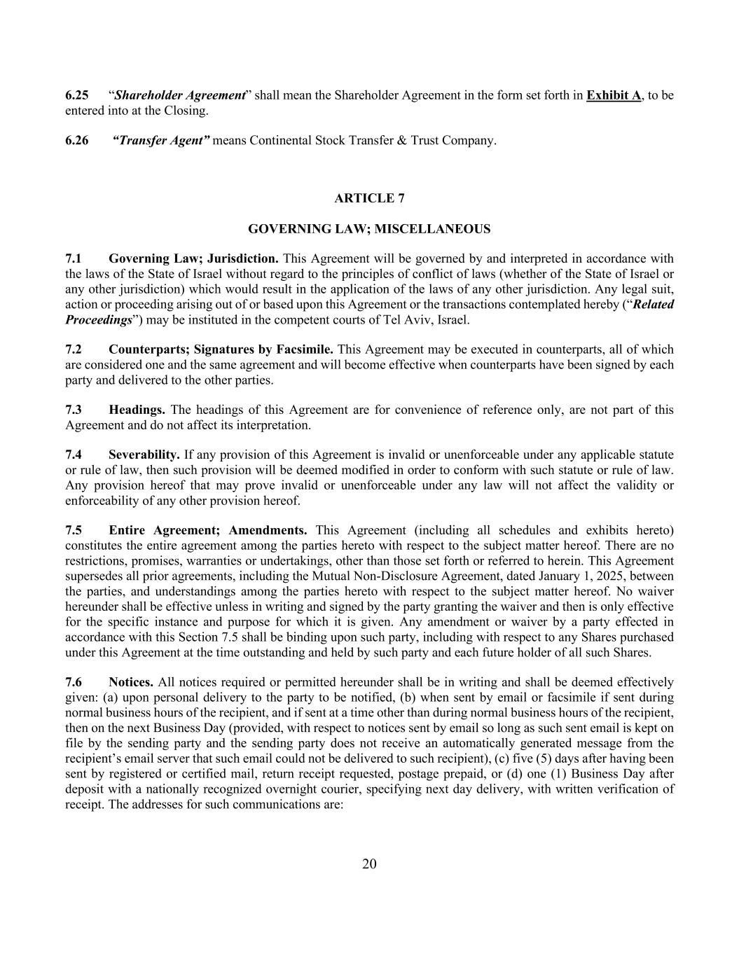 20 6.25 “Shareholder Agreement” shall mean the Shareholder Agreement in the form set forth in Exhibit A, to be entered into at the Closing. 6.26 “Transfer Agent” means Continental Stock Transfer & Trust Company. ARTICLE 7 GOVERNING LAW; MISCELLANEOUS 7.1 Governing Law; Jurisdiction. This Agreement will be governed by and interpreted in accordance with the laws of the State of Israel without regard to the principles of conflict of laws (whether of the State of Israel or any other jurisdiction) which would result in the application of the laws of any other jurisdiction. Any legal suit, action or proceeding arising out of or based upon this Agreement or the transactions contemplated hereby (“Related Proceedings”) may be instituted in the competent courts of Tel Aviv, Israel. 7.2 Counterparts; Signatures by Facsimile. This Agreement may be executed in counterparts, all of which are considered one and the same agreement and will become effective when counterparts have been signed by each party and delivered to the other parties. 7.3 Headings. The headings of this Agreement are for convenience of reference only, are not part of this Agreement and do not affect its interpretation. 7.4 Severability. If any provision of this Agreement is invalid or unenforceable under any applicable statute or rule of law, then such provision will be deemed modified in order to conform with such statute or rule of law. Any provision hereof that may prove invalid or unenforceable under any law will not affect the validity or enforceability of any other provision hereof. 7.5 Entire Agreement; Amendments. This Agreement (including all schedules and exhibits hereto) constitutes the entire agreement among the parties hereto with respect to the subject matter hereof. There are no restrictions, promises, warranties or undertakings, other than those set forth or referred to herein. This Agreement supersedes all prior agreements, including the Mutual Non-Disclosure Agreement, dated January 1, 2025, between the parties, and understandings among the parties hereto with respect to the subject matter hereof. No waiver hereunder shall be effective unless in writing and signed by the party granting the waiver and then is only effective for the specific instance and purpose for which it is given. Any amendment or waiver by a party effected in accordance with this Section 7.5 shall be binding upon such party, including with respect to any Shares purchased under this Agreement at the time outstanding and held by such party and each future holder of all such Shares. 7.6 Notices. All notices required or permitted hereunder shall be in writing and shall be deemed effectively given: (a) upon personal delivery to the party to be notified, (b) when sent by email or facsimile if sent during normal business hours of the recipient, and if sent at a time other than during normal business hours of the recipient, then on the next Business Day (provided, with respect to notices sent by email so long as such sent email is kept on file by the sending party and the sending party does not receive an automatically generated message from the recipient’s email server that such email could not be delivered to such recipient), (c) five (5) days after having been sent by registered or certified mail, return receipt requested, postage prepaid, or (d) one (1) Business Day after deposit with a nationally recognized overnight courier, specifying next day delivery, with written verification of receipt. The addresses for such communications are: