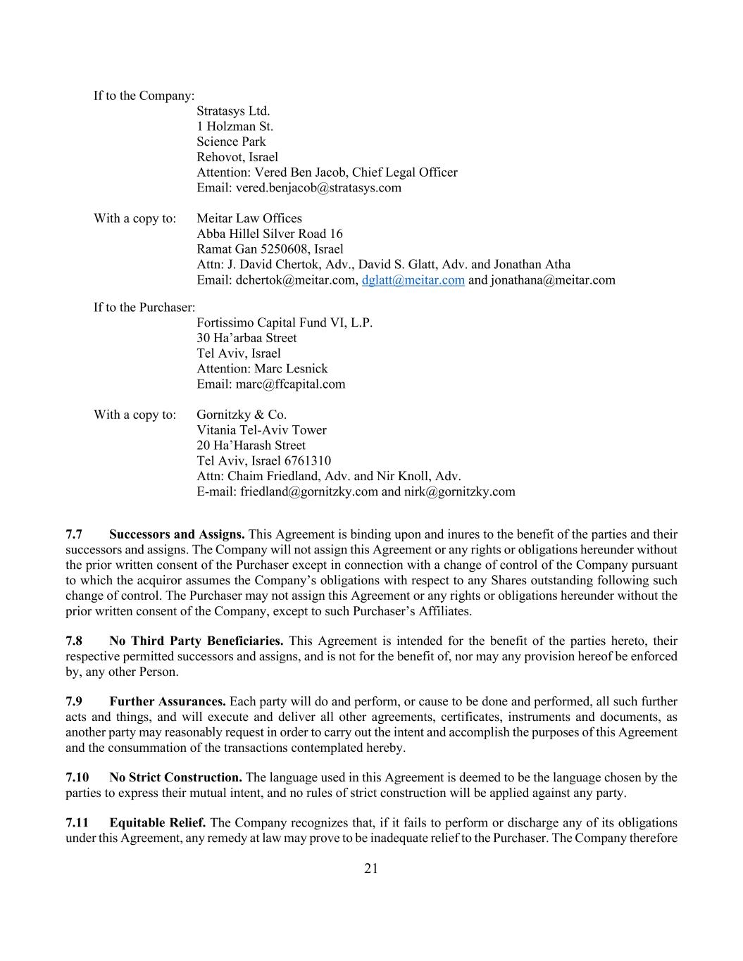 21 If to the Company: Stratasys Ltd. 1 Holzman St. Science Park Rehovot, Israel Attention: Vered Ben Jacob, Chief Legal Officer Email: vered.benjacob@stratasys.com With a copy to: Meitar Law Offices Abba Hillel Silver Road 16 Ramat Gan 5250608, Israel Attn: J. David Chertok, Adv., David S. Glatt, Adv. and Jonathan Atha Email: dchertok@meitar.com, dglatt@meitar.com and jonathana@meitar.com If to the Purchaser: Fortissimo Capital Fund VI, L.P. 30 Ha’arbaa Street Tel Aviv, Israel Attention: Marc Lesnick Email: marc@ffcapital.com With a copy to: Gornitzky & Co. Vitania Tel-Aviv Tower 20 Ha’Harash Street Tel Aviv, Israel 6761310 Attn: Chaim Friedland, Adv. and Nir Knoll, Adv. E-mail: friedland@gornitzky.com and nirk@gornitzky.com 7.7 Successors and Assigns. This Agreement is binding upon and inures to the benefit of the parties and their successors and assigns. The Company will not assign this Agreement or any rights or obligations hereunder without the prior written consent of the Purchaser except in connection with a change of control of the Company pursuant to which the acquiror assumes the Company’s obligations with respect to any Shares outstanding following such change of control. The Purchaser may not assign this Agreement or any rights or obligations hereunder without the prior written consent of the Company, except to such Purchaser’s Affiliates. 7.8 No Third Party Beneficiaries. This Agreement is intended for the benefit of the parties hereto, their respective permitted successors and assigns, and is not for the benefit of, nor may any provision hereof be enforced by, any other Person. 7.9 Further Assurances. Each party will do and perform, or cause to be done and performed, all such further acts and things, and will execute and deliver all other agreements, certificates, instruments and documents, as another party may reasonably request in order to carry out the intent and accomplish the purposes of this Agreement and the consummation of the transactions contemplated hereby. 7.10 No Strict Construction. The language used in this Agreement is deemed to be the language chosen by the parties to express their mutual intent, and no rules of strict construction will be applied against any party. 7.11 Equitable Relief. The Company recognizes that, if it fails to perform or discharge any of its obligations under this Agreement, any remedy at law may prove to be inadequate relief to the Purchaser. The Company therefore