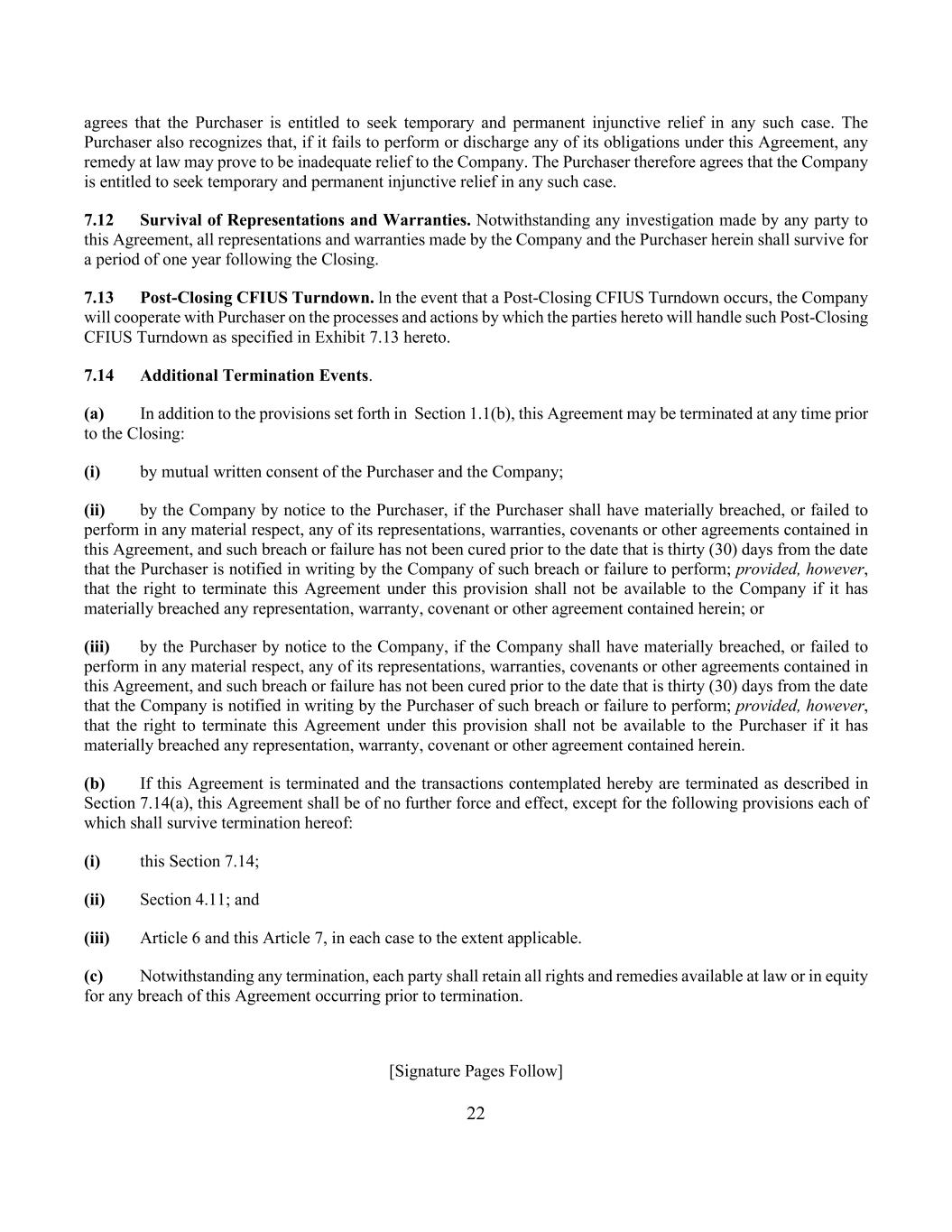 22 agrees that the Purchaser is entitled to seek temporary and permanent injunctive relief in any such case. The Purchaser also recognizes that, if it fails to perform or discharge any of its obligations under this Agreement, any remedy at law may prove to be inadequate relief to the Company. The Purchaser therefore agrees that the Company is entitled to seek temporary and permanent injunctive relief in any such case. 7.12 Survival of Representations and Warranties. Notwithstanding any investigation made by any party to this Agreement, all representations and warranties made by the Company and the Purchaser herein shall survive for a period of one year following the Closing. 7.13 Post-Closing CFIUS Turndown. ln the event that a Post-Closing CFIUS Turndown occurs, the Company will cooperate with Purchaser on the processes and actions by which the parties hereto will handle such Post-Closing CFIUS Turndown as specified in Exhibit 7.13 hereto. 7.14 Additional Termination Events. (a) In addition to the provisions set forth in Section 1.1(b), this Agreement may be terminated at any time prior to the Closing: (i) by mutual written consent of the Purchaser and the Company; (ii) by the Company by notice to the Purchaser, if the Purchaser shall have materially breached, or failed to perform in any material respect, any of its representations, warranties, covenants or other agreements contained in this Agreement, and such breach or failure has not been cured prior to the date that is thirty (30) days from the date that the Purchaser is notified in writing by the Company of such breach or failure to perform; provided, however, that the right to terminate this Agreement under this provision shall not be available to the Company if it has materially breached any representation, warranty, covenant or other agreement contained herein; or (iii) by the Purchaser by notice to the Company, if the Company shall have materially breached, or failed to perform in any material respect, any of its representations, warranties, covenants or other agreements contained in this Agreement, and such breach or failure has not been cured prior to the date that is thirty (30) days from the date that the Company is notified in writing by the Purchaser of such breach or failure to perform; provided, however, that the right to terminate this Agreement under this provision shall not be available to the Purchaser if it has materially breached any representation, warranty, covenant or other agreement contained herein. (b) If this Agreement is terminated and the transactions contemplated hereby are terminated as described in Section 7.14(a), this Agreement shall be of no further force and effect, except for the following provisions each of which shall survive termination hereof: (i) this Section 7.14; (ii) Section 4.11; and (iii) Article 6 and this Article 7, in each case to the extent applicable. (c) Notwithstanding any termination, each party shall retain all rights and remedies available at law or in equity for any breach of this Agreement occurring prior to termination. [Signature Pages Follow]