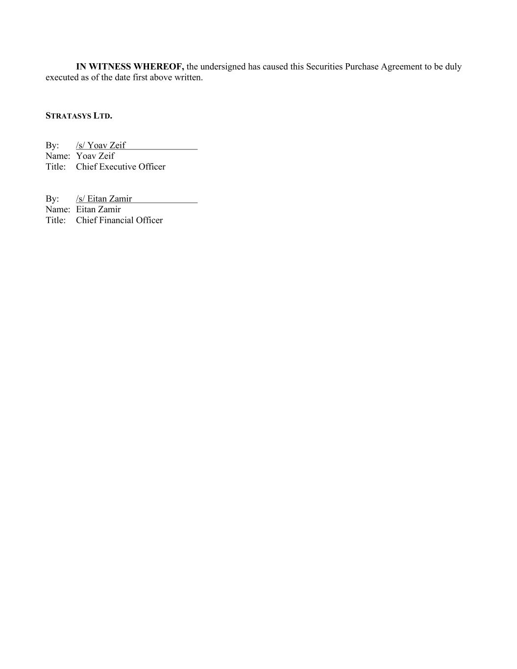 IN WITNESS WHEREOF, the undersigned has caused this Securities Purchase Agreement to be duly executed as of the date first above written. STRATASYS LTD. By: /s/ Yoav Zeif Name: Yoav Zeif Title: Chief Executive Officer By: /s/ Eitan Zamir Name: Eitan Zamir Title: Chief Financial Officer
