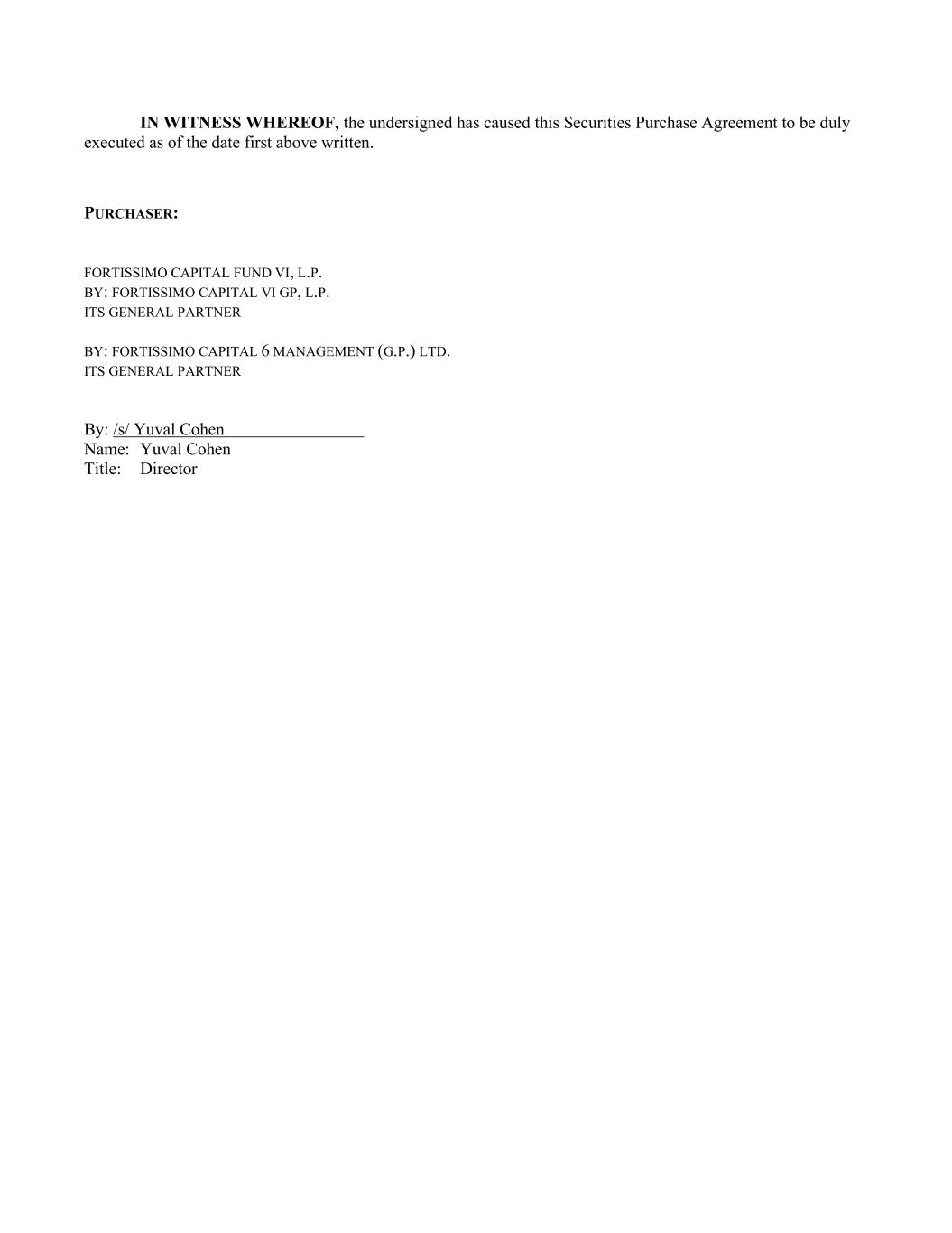 IN WITNESS WHEREOF, the undersigned has caused this Securities Purchase Agreement to be duly executed as of the date first above written. PURCHASER: FORTISSIMO CAPITAL FUND VI, L.P. BY: FORTISSIMO CAPITAL VI GP, L.P. ITS GENERAL PARTNER BY: FORTISSIMO CAPITAL 6 MANAGEMENT (G.P.) LTD. ITS GENERAL PARTNER By: /s/ Yuval Cohen Name: Yuval Cohen Title: Director