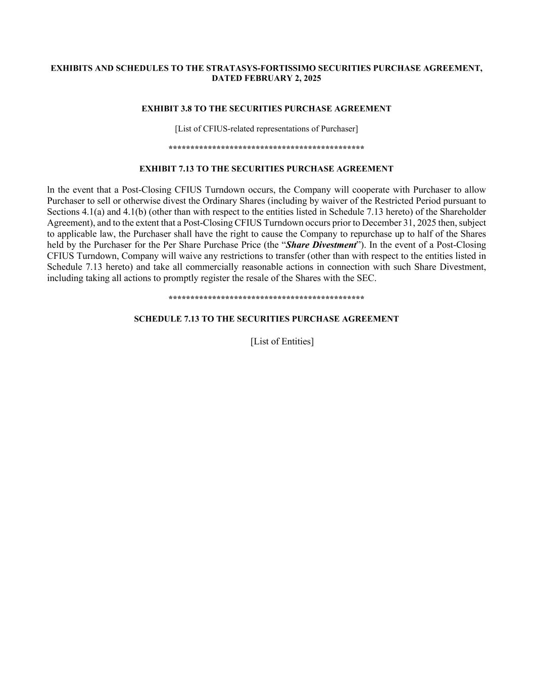 EXHIBITS AND SCHEDULES TO THE STRATASYS-FORTISSIMO SECURITIES PURCHASE AGREEMENT, DATED FEBRUARY 2, 2025 EXHIBIT 3.8 TO THE SECURITIES PURCHASE AGREEMENT [List of CFIUS-related representations of Purchaser] ********************************************* EXHIBIT 7.13 TO THE SECURITIES PURCHASE AGREEMENT ln the event that a Post-Closing CFIUS Turndown occurs, the Company will cooperate with Purchaser to allow Purchaser to sell or otherwise divest the Ordinary Shares (including by waiver of the Restricted Period pursuant to Sections 4.1(a) and 4.1(b) (other than with respect to the entities listed in Schedule 7.13 hereto) of the Shareholder Agreement), and to the extent that a Post-Closing CFIUS Turndown occurs prior to December 31, 2025 then, subject to applicable law, the Purchaser shall have the right to cause the Company to repurchase up to half of the Shares held by the Purchaser for the Per Share Purchase Price (the “Share Divestment”). In the event of a Post-Closing CFIUS Turndown, Company will waive any restrictions to transfer (other than with respect to the entities listed in Schedule 7.13 hereto) and take all commercially reasonable actions in connection with such Share Divestment, including taking all actions to promptly register the resale of the Shares with the SEC. ********************************************* SCHEDULE 7.13 TO THE SECURITIES PURCHASE AGREEMENT [List of Entities]