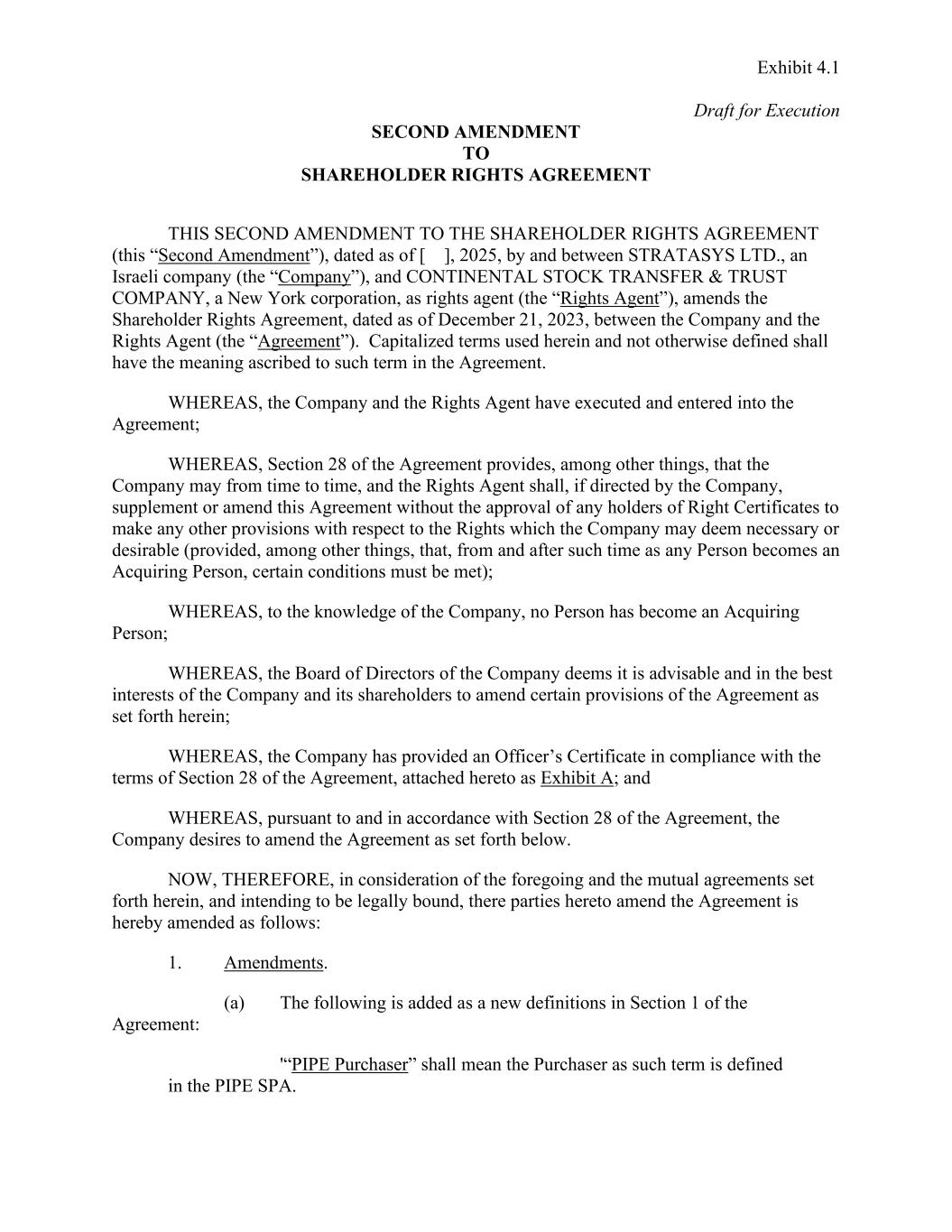 Exhibit 4.1 Draft for Execution SECOND AMENDMENT TO SHAREHOLDER RIGHTS AGREEMENT THIS SECOND AMENDMENT TO THE SHAREHOLDER RIGHTS AGREEMENT (this “Second Amendment”), dated as of [ ], 2025, by and between STRATASYS LTD., an Israeli company (the “Company”), and CONTINENTAL STOCK TRANSFER & TRUST COMPANY, a New York corporation, as rights agent (the “Rights Agent”), amends the Shareholder Rights Agreement, dated as of December 21, 2023, between the Company and the Rights Agent (the “Agreement”). Capitalized terms used herein and not otherwise defined shall have the meaning ascribed to such term in the Agreement. WHEREAS, the Company and the Rights Agent have executed and entered into the Agreement; WHEREAS, Section 28 of the Agreement provides, among other things, that the Company may from time to time, and the Rights Agent shall, if directed by the Company, supplement or amend this Agreement without the approval of any holders of Right Certificates to make any other provisions with respect to the Rights which the Company may deem necessary or desirable (provided, among other things, that, from and after such time as any Person becomes an Acquiring Person, certain conditions must be met); WHEREAS, to the knowledge of the Company, no Person has become an Acquiring Person; WHEREAS, the Board of Directors of the Company deems it is advisable and in the best interests of the Company and its shareholders to amend certain provisions of the Agreement as set forth herein; WHEREAS, the Company has provided an Officer’s Certificate in compliance with the terms of Section 28 of the Agreement, attached hereto as Exhibit A; and WHEREAS, pursuant to and in accordance with Section 28 of the Agreement, the Company desires to amend the Agreement as set forth below. NOW, THEREFORE, in consideration of the foregoing and the mutual agreements set forth herein, and intending to be legally bound, there parties hereto amend the Agreement is hereby amended as follows: 1. Amendments. (a) The following is added as a new definitions in Section 1 of the Agreement: '“PIPE Purchaser” shall mean the Purchaser as such term is defined in the PIPE SPA.