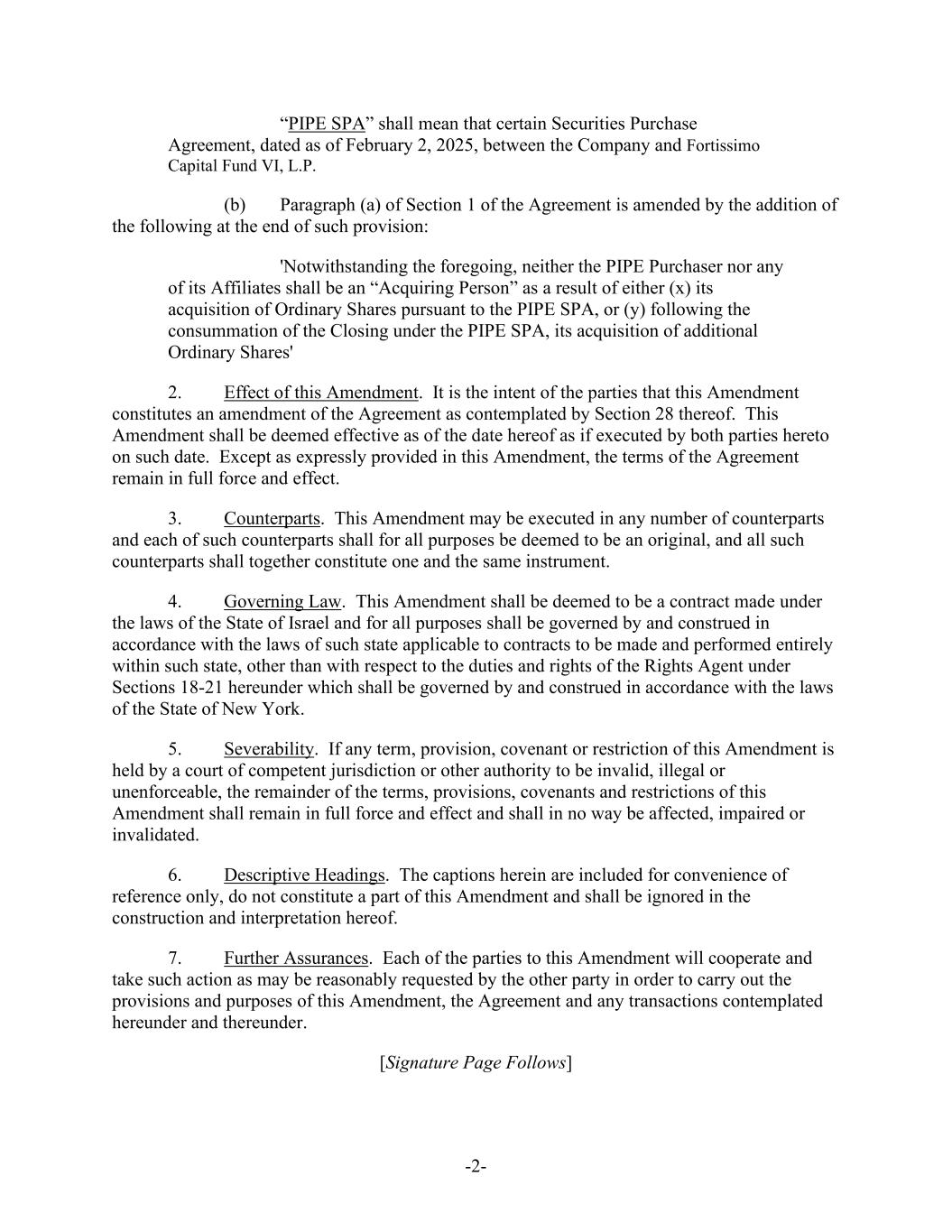 -2- “PIPE SPA” shall mean that certain Securities Purchase Agreement, dated as of February 2, 2025, between the Company and Fortissimo Capital Fund VI, L.P. (b) Paragraph (a) of Section 1 of the Agreement is amended by the addition of the following at the end of such provision: 'Notwithstanding the foregoing, neither the PIPE Purchaser nor any of its Affiliates shall be an “Acquiring Person” as a result of either (x) its acquisition of Ordinary Shares pursuant to the PIPE SPA, or (y) following the consummation of the Closing under the PIPE SPA, its acquisition of additional Ordinary Shares' 2. Effect of this Amendment. It is the intent of the parties that this Amendment constitutes an amendment of the Agreement as contemplated by Section 28 thereof. This Amendment shall be deemed effective as of the date hereof as if executed by both parties hereto on such date. Except as expressly provided in this Amendment, the terms of the Agreement remain in full force and effect. 3. Counterparts. This Amendment may be executed in any number of counterparts and each of such counterparts shall for all purposes be deemed to be an original, and all such counterparts shall together constitute one and the same instrument. 4. Governing Law. This Amendment shall be deemed to be a contract made under the laws of the State of Israel and for all purposes shall be governed by and construed in accordance with the laws of such state applicable to contracts to be made and performed entirely within such state, other than with respect to the duties and rights of the Rights Agent under Sections 18-21 hereunder which shall be governed by and construed in accordance with the laws of the State of New York. 5. Severability. If any term, provision, covenant or restriction of this Amendment is held by a court of competent jurisdiction or other authority to be invalid, illegal or unenforceable, the remainder of the terms, provisions, covenants and restrictions of this Amendment shall remain in full force and effect and shall in no way be affected, impaired or invalidated. 6. Descriptive Headings. The captions herein are included for convenience of reference only, do not constitute a part of this Amendment and shall be ignored in the construction and interpretation hereof. 7. Further Assurances. Each of the parties to this Amendment will cooperate and take such action as may be reasonably requested by the other party in order to carry out the provisions and purposes of this Amendment, the Agreement and any transactions contemplated hereunder and thereunder. [Signature Page Follows]