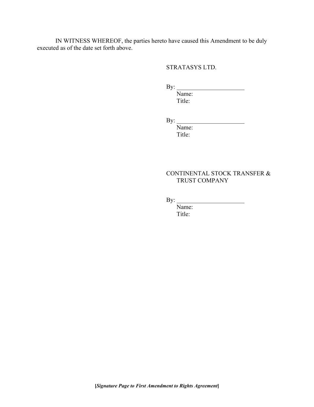 [Signature Page to First Amendment to Rights Agreement] IN WITNESS WHEREOF, the parties hereto have caused this Amendment to be duly executed as of the date set forth above. STRATASYS LTD. By: ______________________ Name: Title: By: ______________________ Name: Title: CONTINENTAL STOCK TRANSFER & TRUST COMPANY By: ______________________ Name: Title: