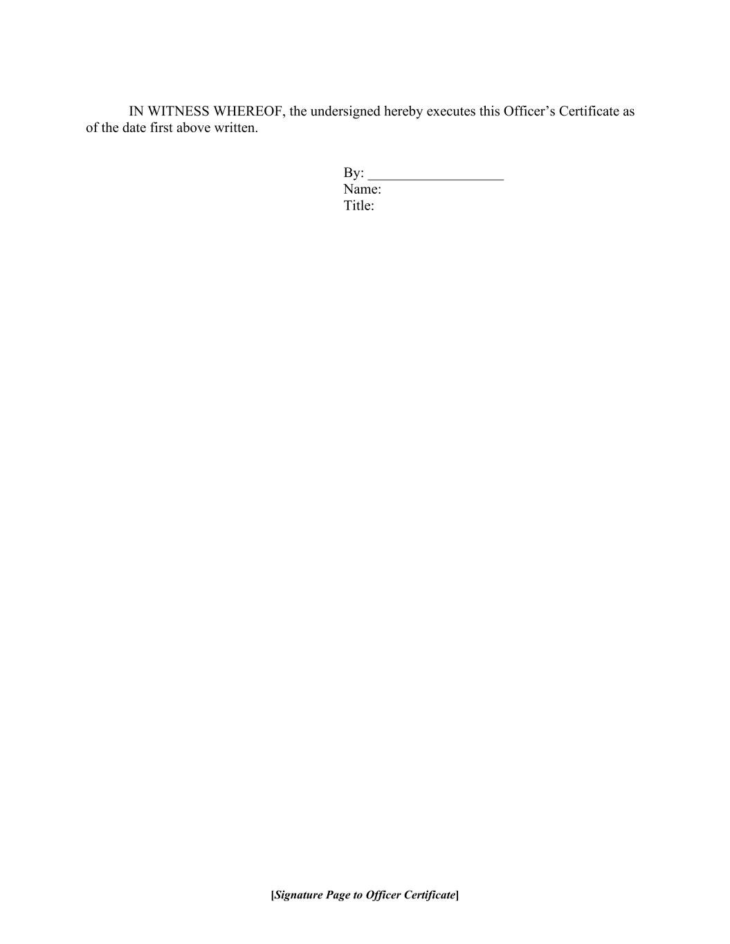 [Signature Page to Officer Certificate] IN WITNESS WHEREOF, the undersigned hereby executes this Officer’s Certificate as of the date first above written. By: ___________________ Name: Title: