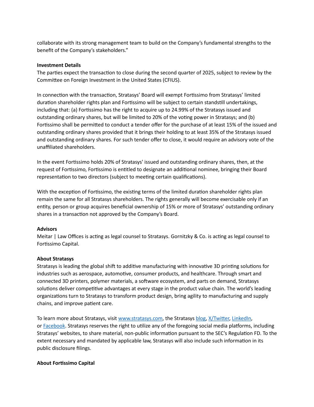 collaborate with its strong management team to build on the Company’s fundamental strengths to the benefit of the Company’s stakeholders.” Investment Details The parties expect the transaction to close during the second quarter of 2025, subject to review by the Committee on Foreign Investment in the United States (CFIUS). In connection with the transaction, Stratasys’ Board will exempt Fortissimo from Stratasys’ limited duration shareholder rights plan and Fortissimo will be subject to certain standstill undertakings, including that: (a) Fortissimo has the right to acquire up to 24.99% of the Stratasys issued and outstanding ordinary shares, but will be limited to 20% of the voting power in Stratasys; and (b) Fortissimo shall be permitted to conduct a tender offer for the purchase of at least 15% of the issued and outstanding ordinary shares provided that it brings their holding to at least 35% of the Stratasys issued and outstanding ordinary shares. For such tender offer to close, it would require an advisory vote of the unaffiliated shareholders. In the event Fortissimo holds 20% of Stratasys' issued and outstanding ordinary shares, then, at the request of Fortissimo, Fortissimo is entitled to designate an additional nominee, bringing their Board representation to two directors (subject to meeting certain qualifications). With the exception of Fortissimo, the existing terms of the limited duration shareholder rights plan remain the same for all Stratasys shareholders. The rights generally will become exercisable only if an entity, person or group acquires beneficial ownership of 15% or more of Stratasys’ outstanding ordinary shares in a transaction not approved by the Company’s Board. Advisors Meitar | Law Offices is acting as legal counsel to Stratasys. Gornitzky & Co. is acting as legal counsel to Fortissimo Capital. About Stratasys Stratasys is leading the global shift to additive manufacturing with innovative 3D printing solutions for industries such as aerospace, automotive, consumer products, and healthcare. Through smart and connected 3D printers, polymer materials, a software ecosystem, and parts on demand, Stratasys solutions deliver competitive advantages at every stage in the product value chain. The world’s leading organizations turn to Stratasys to transform product design, bring agility to manufacturing and supply chains, and improve patient care. To learn more about Stratasys, visit www.stratasys.com, the Stratasys blog, X/Twitter, LinkedIn, or Facebook. Stratasys reserves the right to utilize any of the foregoing social media platforms, including Stratasys’ websites, to share material, non-public information pursuant to the SEC’s Regulation FD. To the extent necessary and mandated by applicable law, Stratasys will also include such information in its public disclosure filings. About Fortissimo Capital