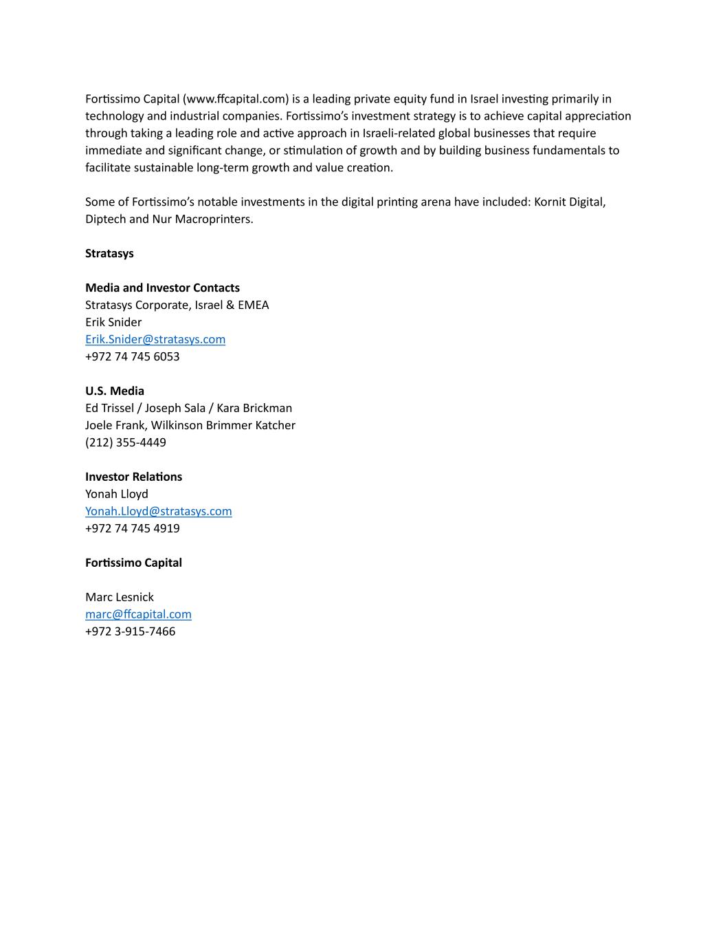 Fortissimo Capital (www.ffcapital.com) is a leading private equity fund in Israel investing primarily in technology and industrial companies. Fortissimo’s investment strategy is to achieve capital appreciation through taking a leading role and active approach in Israeli-related global businesses that require immediate and significant change, or stimulation of growth and by building business fundamentals to facilitate sustainable long-term growth and value creation. Some of Fortissimo’s notable investments in the digital printing arena have included: Kornit Digital, Diptech and Nur Macroprinters. Stratasys Media and Investor Contacts Stratasys Corporate, Israel & EMEA Erik Snider Erik.Snider@stratasys.com +972 74 745 6053 U.S. Media Ed Trissel / Joseph Sala / Kara Brickman Joele Frank, Wilkinson Brimmer Katcher (212) 355-4449 Investor Relations Yonah Lloyd Yonah.Lloyd@stratasys.com +972 74 745 4919 Fortissimo Capital Marc Lesnick marc@ffcapital.com +972 3-915-7466
