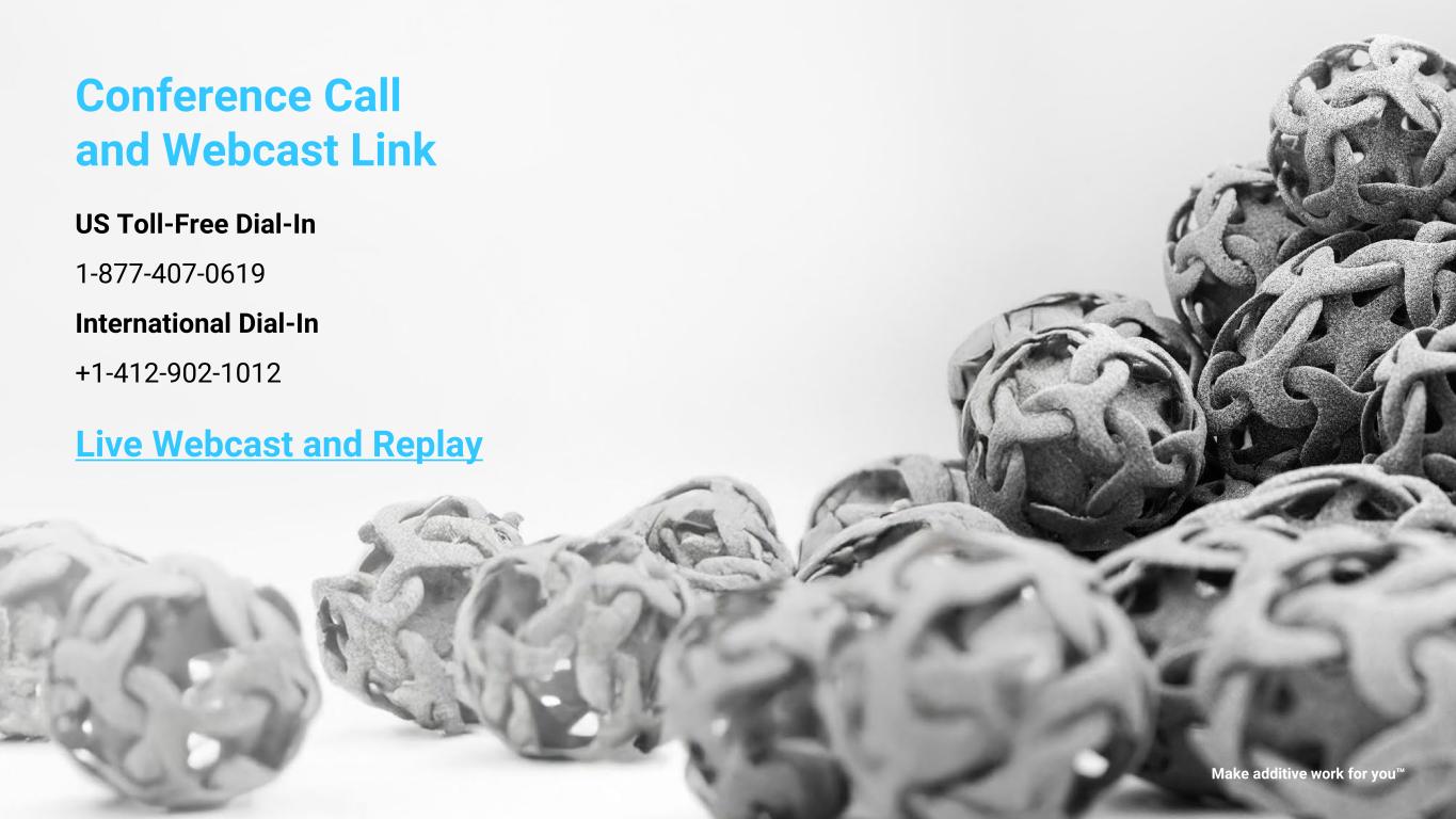 Conference Call and Webcast Link US Toll-Free Dial-In 1-877-407-0619 International Dial-In +1-412-902-1012 Make additive work for you Live Webcast and Replay