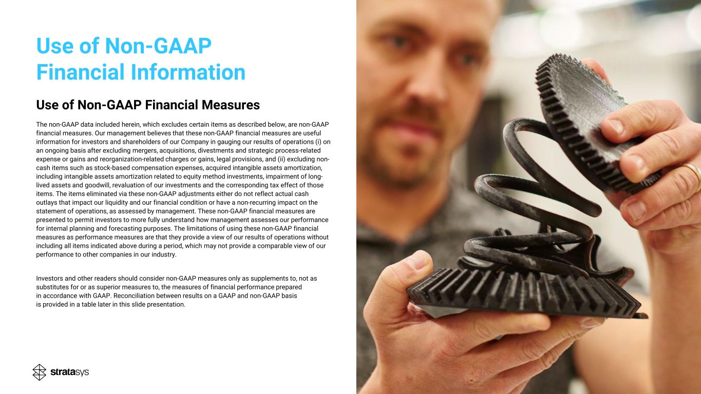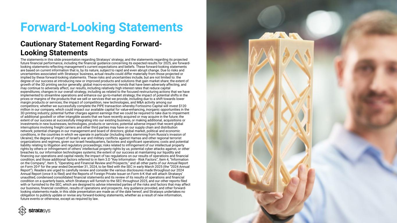 Forward-Looking Statements Cautionary Statement Regarding Forward- Looking Statements The statements in this slide presentation regarding Stratasys' strategy, and the statements regarding its projected future financial performance, including the financial guidance concerning its expected results for 2025, are forward- looking statements reflecting management's current expectations and beliefs. These forward-looking statements are based on current information that is, by its nature, subject to rapid and even abrupt change. Due to risks and uncertainties associated with Stratasys' business, actual results could differ materially from those projected or implied by these forward-looking statements. These risks and uncertainties include, but are not limited to: the degree of our success at introducing new or improved products and solutions that gain market share; the extent of growth of the 3D printing sector generally; global macro-economic trends that have been adversely affecting, and may continue to adversely affect, our results, including relatively high interest rates that reduce capital expenditures; changes in our overall strategy, including as related to the focused restructuring actions that we have implemented to streamline operations and enhance our go-to-market strategy; the impact of potential shifts in the prices or margins of the products that we sell or services that we provide, including due to a shift towards lower margin products or services; the impact of competition, new technologies, and M&A activity among our competitors; whether we successfully complete the PIPE transaction whereby Fortissimo Capital will invest $120 million in our company, which could impact our available capital for value-enhancing, inorganic opportunities in the 3D printing industry; potential further charges against earnings that we could be required to take due to impairment of additional goodwill or other intangible assets that we have recently acquired or may acquire in the future; the extent of our success at successfully integrating into our existing business, or making additional, acquisitions or investments in new businesses, technologies, products or services; potential adverse impact that recent global interruptions involving freight carriers and other third parties may have on our supply chain and distribution network; potential changes in our management and board of directors; global market, political and economic conditions, in the countries in which we operate in particular (including risks stemming from Russia’s invasion of Ukraine); the degree of impact of Israel’s war and military conflicts against Hamas and other regional terrorist organizations and regimes, given our Israeli headquarters, factories and significant operations; costs and potential liability relating to litigation and regulatory proceedings; risks related to infringement of our intellectual property rights by others or infringement of others' intellectual property rights by us; potential cyber attacks against, or other breaches to, our information technologies systems; the extent of our success at maintaining our liquidity and financing our operations and capital needs; the impact of tax regulations on our results of operations and financial condition; and those additional factors referred to in Item 3.D “Key Information - Risk Factors”, Item 4, “Information on the Company”, Item 5, “Operating and Financial Review and Prospects,” and all other parts of our Annual Report on Form 20-F for the year ended December 31, 2024, to be filed with the SEC in early March 2025 (the “2024 Annual Report”). Readers are urged to carefully review and consider the various disclosures made throughout our 2024 Annual Report (once it is filed) and the Reports of Foreign Private Issuer on Form 6-K that will attach Stratasys’ unaudited, condensed consolidated financial statements and its review of its results of operations and financial condition on a quarterly basis, which Stratasys will furnish to the SEC throughout 2025, and our other reports filed with or furnished to the SEC, which are designed to advise interested parties of the risks and factors that may affect our business, financial condition, results of operations and prospects. Any guidance provided, and other forward- looking statements made, in this slide presentation are made as of the date hereof, and Stratasys undertakes no obligation to publicly update or revise any forward-looking statements, whether as a result of new information, future events or otherwise, except as required by law. Make additive work for you