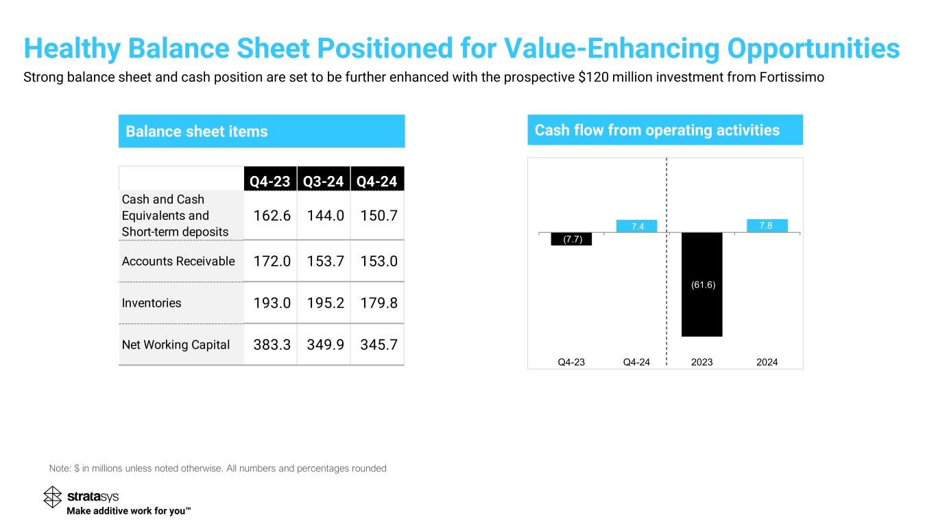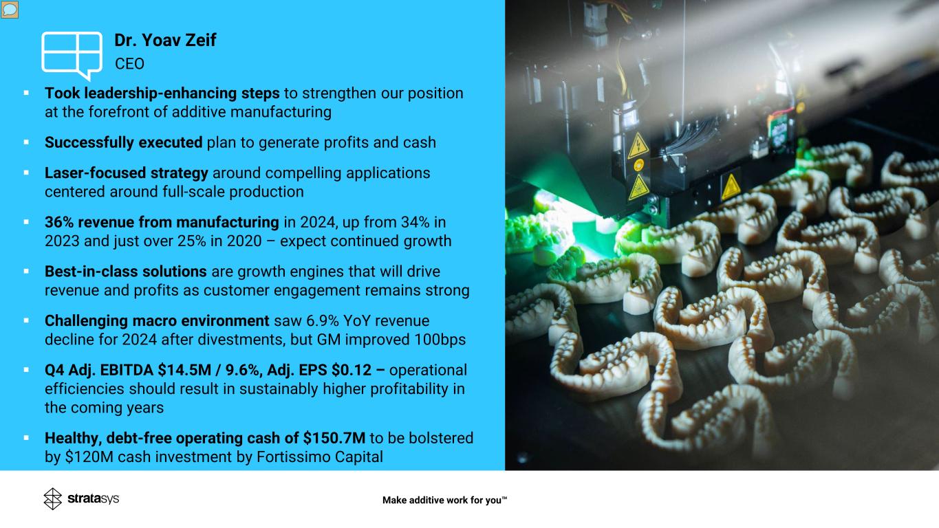 CEO Dr. Yoav Zeif Took leadership-enhancing steps to strengthen our position at the forefront of additive manufacturing Successfully executed plan to generate profits and cash Laser-focused strategy around compelling applications centered around full-scale production 36% revenue from manufacturing in 2024, up from 34% in 2023 and just over 25% in 2020 – expect continued growth Best-in-class solutions are growth engines that will drive revenue and profits as customer engagement remains strong Challenging macro environment saw 6.9% YoY revenue decline for 2024 after divestments, but GM improved 100bps Q4 Adj. EBITDA $14.5M / 9.6%, Adj. EPS $0.12 – operational efficiencies should result in sustainably higher profitability in the coming years Healthy, debt-free operating cash of $150.7M to be bolstered by $120M cash investment by Fortissimo Capital Make additive work for you