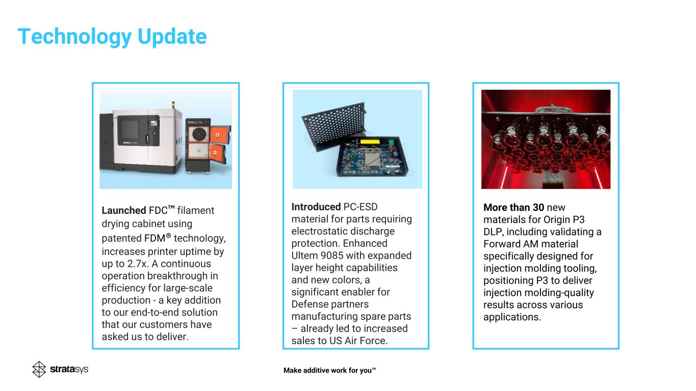 Make additive work for you More than 30 new materials for Origin P3 DLP, including validating a Forward AM material specifically designed for injection molding tooling, positioning P3 to deliver injection molding-quality results across various applications. Launched FDC filament drying cabinet using patented FDM® technology, increases printer uptime by up to 2.7x. A continuous operation breakthrough in efficiency for large-scale production - a key addition to our end-to-end solution that our customers have asked us to deliver. Introduced PC-ESD material for parts requiring electrostatic discharge protection. Enhanced Ultem 9085 with expanded layer height capabilities and new colors, a significant enabler for Defense partners manufacturing spare parts – already led to increased sales to US Air Force. Technology Update