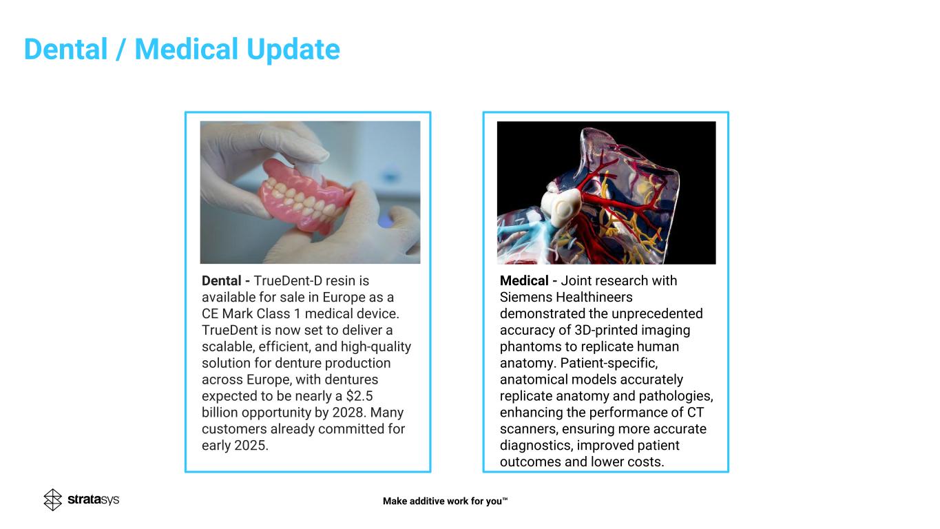 Make additive work for you Medical - Joint research with Siemens Healthineers demonstrated the unprecedented accuracy of 3D-printed imaging phantoms to replicate human anatomy. Patient-specific, anatomical models accurately replicate anatomy and pathologies, enhancing the performance of CT scanners, ensuring more accurate diagnostics, improved patient outcomes and lower costs. Dental - TrueDent-D resin is available for sale in Europe as a CE Mark Class 1 medical device. TrueDent is now set to deliver a scalable, efficient, and high-quality solution for denture production across Europe, with dentures expected to be nearly a $2.5 billion opportunity by 2028. Many customers already committed for early 2025. Dental / Medical Update