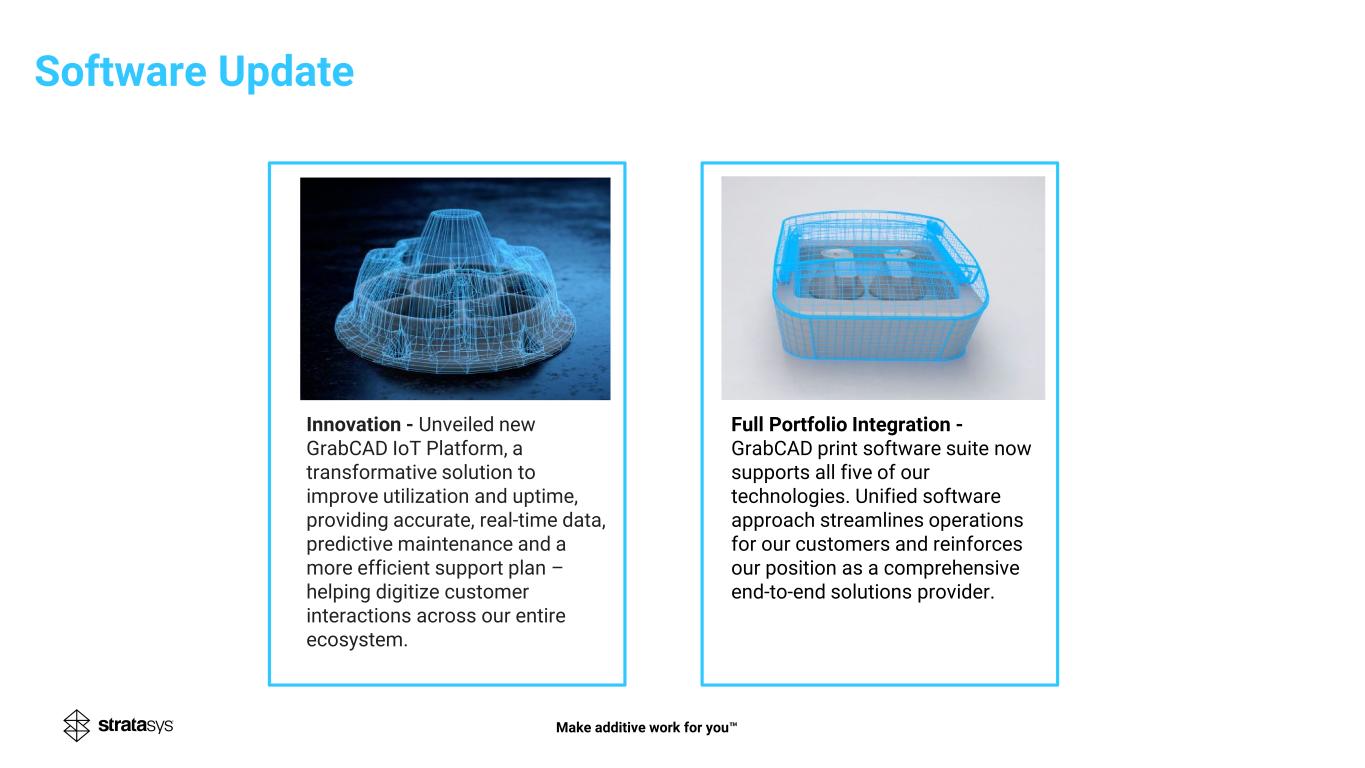 Make additive work for you Full Portfolio Integration - GrabCAD print software suite now supports all five of our technologies. Unified software approach streamlines operations for our customers and reinforces our position as a comprehensive end-to-end solutions provider. Software Update Innovation - Unveiled new GrabCAD IoT Platform, a transformative solution to improve utilization and uptime, providing accurate, real-time data, predictive maintenance and a more efficient support plan – helping digitize customer interactions across our entire ecosystem.