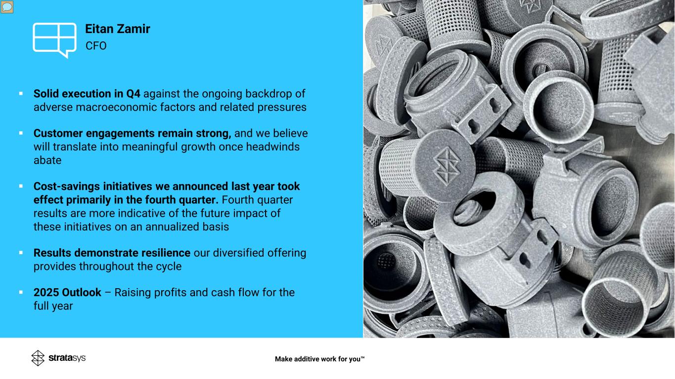 CFO Eitan Zamir Solid execution in Q4 against the ongoing backdrop of adverse macroeconomic factors and related pressures Customer engagements remain strong, and we believe will translate into meaningful growth once headwinds abate Cost-savings initiatives we announced last year took effect primarily in the fourth quarter. Fourth quarter results are more indicative of the future impact of these initiatives on an annualized basis Results demonstrate resilience our diversified offering provides throughout the cycle 2025 Outlook – Raising profits and cash flow for the full year Make additive work for you