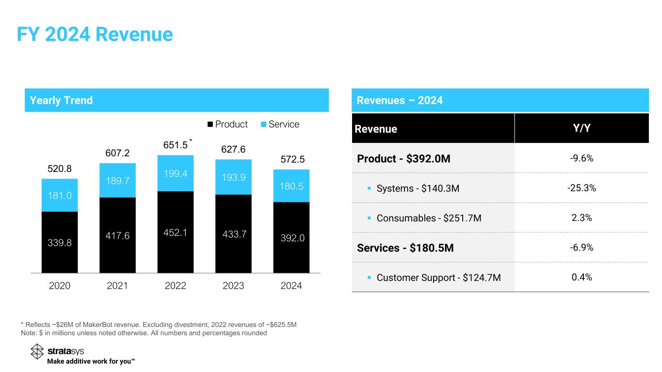 Revenues – 2024 Revenue Y/Y Product - $392.0M -9.6% Systems - $140.3M -25.3% Consumables - $251.7M 2.3% Services - $180.5M -6.9% Customer Support - $124.7M 0.4% FY 2024 Revenue Make additive work for you Yearly Trend 339.8 417.6 452.1 433.7 392.0 181.0 189.7 199.4 193.9 180.5 520.8 607.2 651.5 627.6 572.5 2020 2021 2022 2023 2024 Product Service * * Reflects ~$26M of MakerBot revenue. Excluding divestment, 2022 revenues of ~$625.5M Note: $ in millions unless noted otherwise. All numbers and percentages rounded