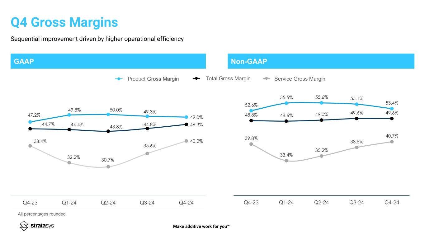 GAAP Non-GAAP 47.4% 47.2% 49.8% 50.0% 49.3% 24.4% 38.4% 32.2% 30.7% 35.6% 40.5% 44.6% 44.4% 43.8% 44.8% Q3-23 Q4-23 Q1-24 Q2-24 Q3-24 48.8% 48.6% 49.0% 49.6% 49.6% 52.6% 55.5% 55.6% 55.1% 53.4% 39.8% 33.4% 35.2% 38.5% 40.7% Q4-23 Q1-24 Q2-24 Q3-24 Q4-24 Service Gross MarginProduct Gross Margin Total Gross Margin Q4 Gross Margins Make additive work for you All percentages rounded. . . . . . . . . . . . . . . . - - - - - 47.4% 47.2% 49.8% 50.0% 49.3% 24.4% 38.4% 32.2% 30.7% 35.6% 40.5% 44.6% 44.4% 43.8% 44.8% Q3-23 Q4-23 Q1-24 Q2-24 Q3-24 47.2% 49.8% 50.0% 49.3% 49.0% 38.4% 32.2% 30.7% 35.6% 40.2% 44.7% 44.4% 43.8% 44.8% 46.3% Q4-23 Q1-24 Q2-24 Q3-24 Q4-24 Sequential improvement driven by higher operational efficiency