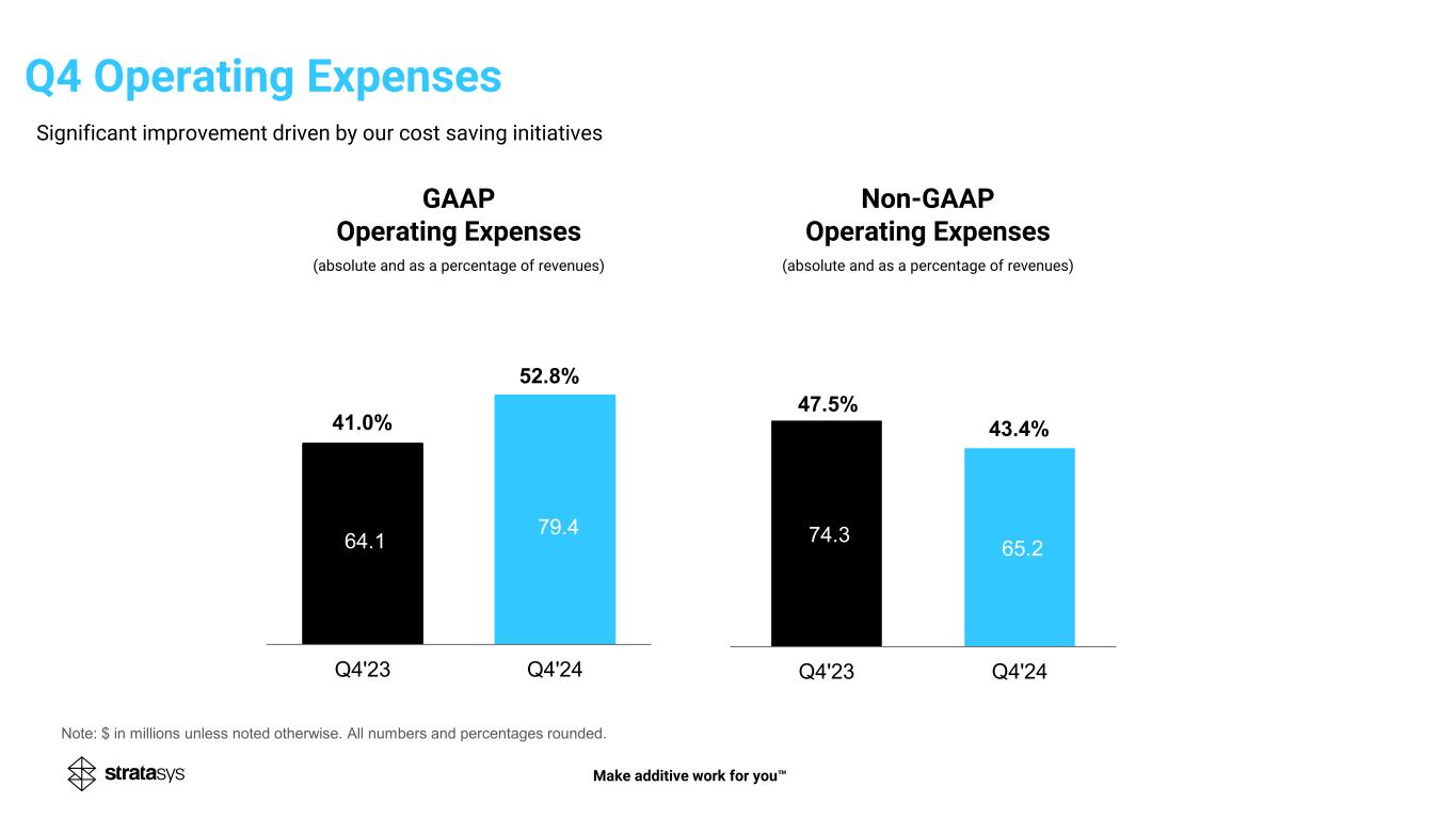 GAAP Operating Expenses (absolute and as a percentage of revenues) Non-GAAP Operating Expenses (absolute and as a percentage of revenues) 64.1 79.4 52.8% Q4'23 Q4'24 74.3 65.2 Q4'23 Q4'24 43.4%41.0% 47.5% Make additive work for you Note: $ in millions unless noted otherwise. All numbers and percentages rounded. Q4 Operating Expenses Significant improvement driven by our cost saving initiatives