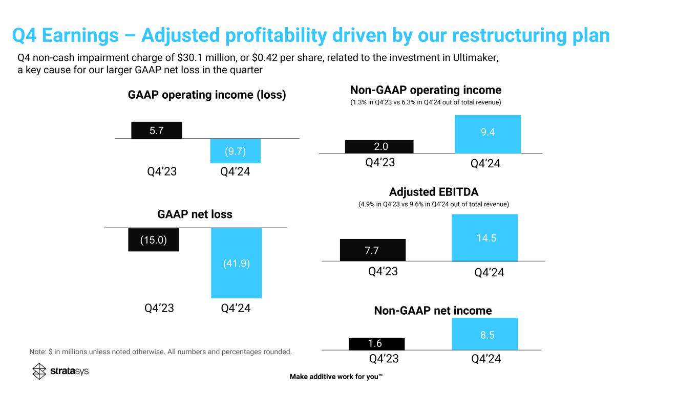 (15.0) )41.9( 5.7 (9.7) Non-GAAP operating income (1.3% in Q4’23 vs 6.3% in Q4’24 out of total revenue) GAAP operating income (loss) Non-GAAP net income GAAP net loss Note: $ in millions unless noted otherwise. All numbers and percentages rounded. Q4’23 Q4’24 14.5 7.7 8.5 Adjusted EBITDA (4.9% in Q4’23 vs 9.6% in Q4’24 out of total revenue) 2.0 9.4 1.6 Q4’23 Q4’24 Q4’23 Q4’24 Q4’23 Q4’24 Make additive work for you Q4 Earnings – Adjusted profitability driven by our restructuring plan Q4’23 Q4’24 Q4 non-cash impairment charge of $30.1 million, or $0.42 per share, related to the investment in Ultimaker, a key cause for our larger GAAP net loss in the quarter