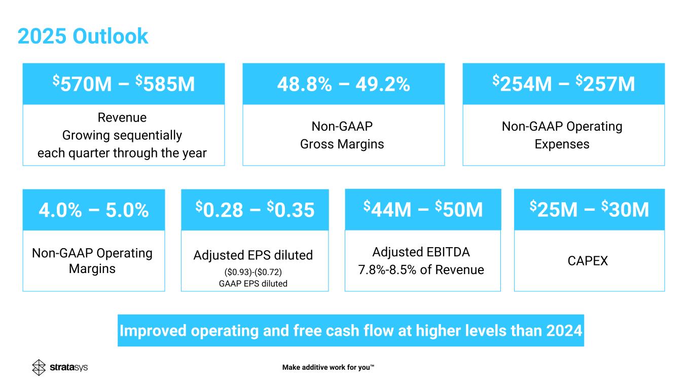 Revenue Growing sequentially each quarter through the year Non-GAAP Gross Margins Non-GAAP Operating Expenses Non-GAAP Operating Margins Adjusted EPS diluted ($0.93)-($0.72) GAAP EPS diluted CAPEX Adjusted EBITDA 7.8%-8.5% of Revenue $570M – $585M 48.8% – 49.2% $254M – $257M $25M – $30M$44M – $50M Make additive work for you 2025 Outlook $0.28 – $0.354.0% – 5.0% Improved operating and free cash flow at higher levels than 2024