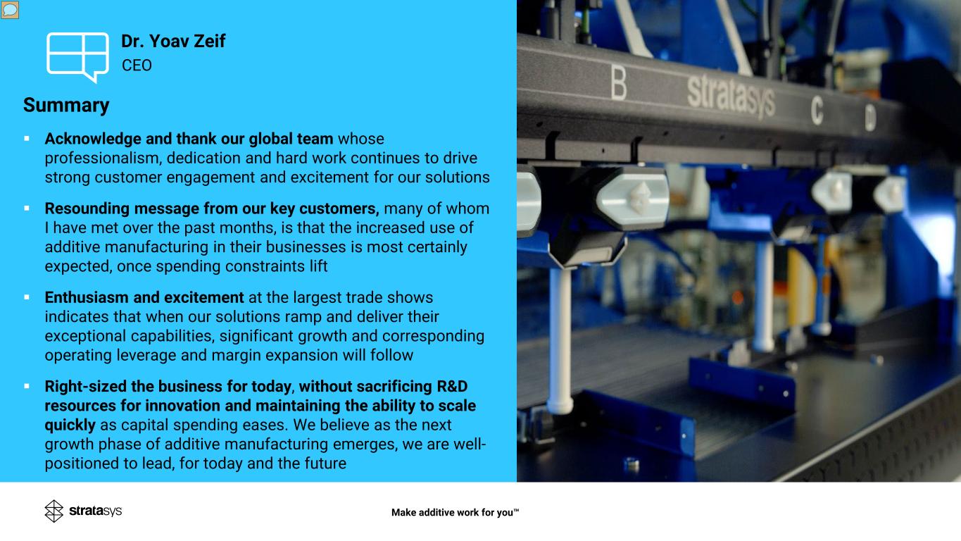 CEO Dr. Yoav Zeif Summary Acknowledge and thank our global team whose professionalism, dedication and hard work continues to drive strong customer engagement and excitement for our solutions Resounding message from our key customers, many of whom I have met over the past months, is that the increased use of additive manufacturing in their businesses is most certainly expected, once spending constraints lift Enthusiasm and excitement at the largest trade shows indicates that when our solutions ramp and deliver their exceptional capabilities, significant growth and corresponding operating leverage and margin expansion will follow Right-sized the business for today, without sacrificing R&D resources for innovation and maintaining the ability to scale quickly as capital spending eases. We believe as the next growth phase of additive manufacturing emerges, we are well- positioned to lead, for today and the future Make additive work for you