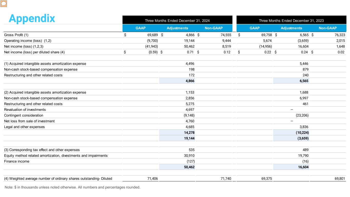 GAAP Adjustments Non-GAAP GAAP Adjustments Non-GAAP Gross Profit (1) $ 69,689 $ 4,866 $ 74,555 $ 69,758 $ 6,565 $ 76,323 Operating income (loss) (1,2) (9,700) 19,144 9,444 5,674 (3,659) 2,015 Net income (loss) (1,2,3) (41,943) 50,462 8,519 (14,956) 16,604 1,648 Net income (loss) per diluted share (4) $ (0.59) $ 0.71 $ 0.12 $ 0.22 $ 0.24 $ 0.02 (1) Acquired intangible assets amortization expense 4,496 5,446 Non-cash stock-based compensation expense 198 879 Restructuring and other related costs 172 240 4,866 6,565 (2) Acquired intangible assets amortization expense 1,153 1,688 Non-cash stock-based compensation expense 2,856 6,997 Restructuring and other related costs 5,275 461 Revaluation of investments 4,697 — Contingent consideration (9,148) (23,206) Net loss from sale of investment 4,760 — Legal and other expenses 4,685 3,836 14,278 (10,224) 19,144 (3,659) (3) Corresponding tax effect and other expenses 535 489 Equity method related amortization, divestments and impairments 30,910 19,790 Finance income (127) (16) 50,462 16,604 (4) Weighted average number of ordinary shares outstanding- Diluted 71,406 71,740 69,375 69,801 Three Months Ended December 31, 2024 Three Months Ended December 31, 2023 Note: $ in thousands unless noted otherwise. All numbers and percentages rounded. Appendix