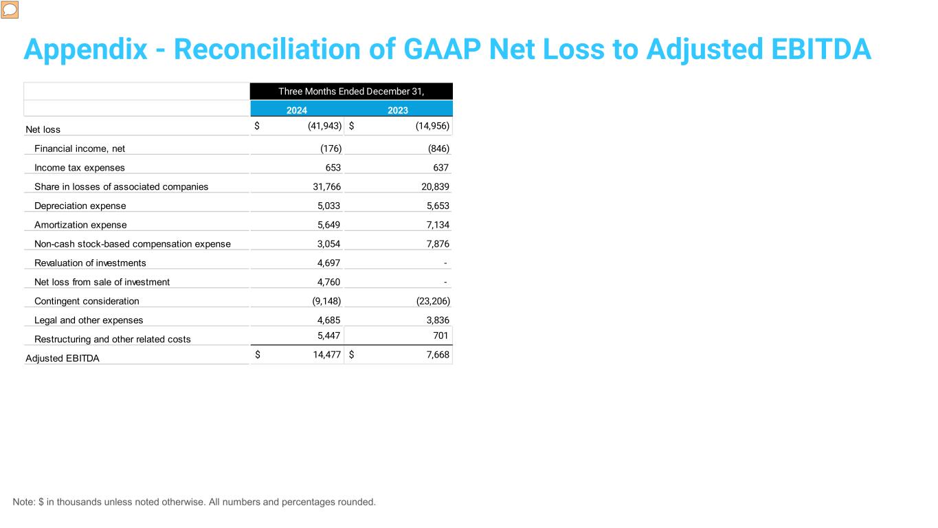 Note: $ in thousands unless noted otherwise. All numbers and percentages rounded. Appendix - Reconciliation of GAAP Net Loss to Adjusted EBITDA 2024 2023 Net loss $ (41,943) $ (14,956) Financial income, net (176) (846) Income tax expenses 653 637 Share in losses of associated companies 31,766 20,839 Depreciation expense 5,033 5,653 Amortization expense 5,649 7,134 Non-cash stock-based compensation expense 3,054 7,876 Revaluation of investments 4,697 - Net loss from sale of investment 4,760 - Contingent consideration (9,148) (23,206) Legal and other expenses 4,685 3,836 Restructuring and other related costs 5,447 701 Adjusted EBITDA $ 14,477 $ 7,668 Three Months Ended December 31,