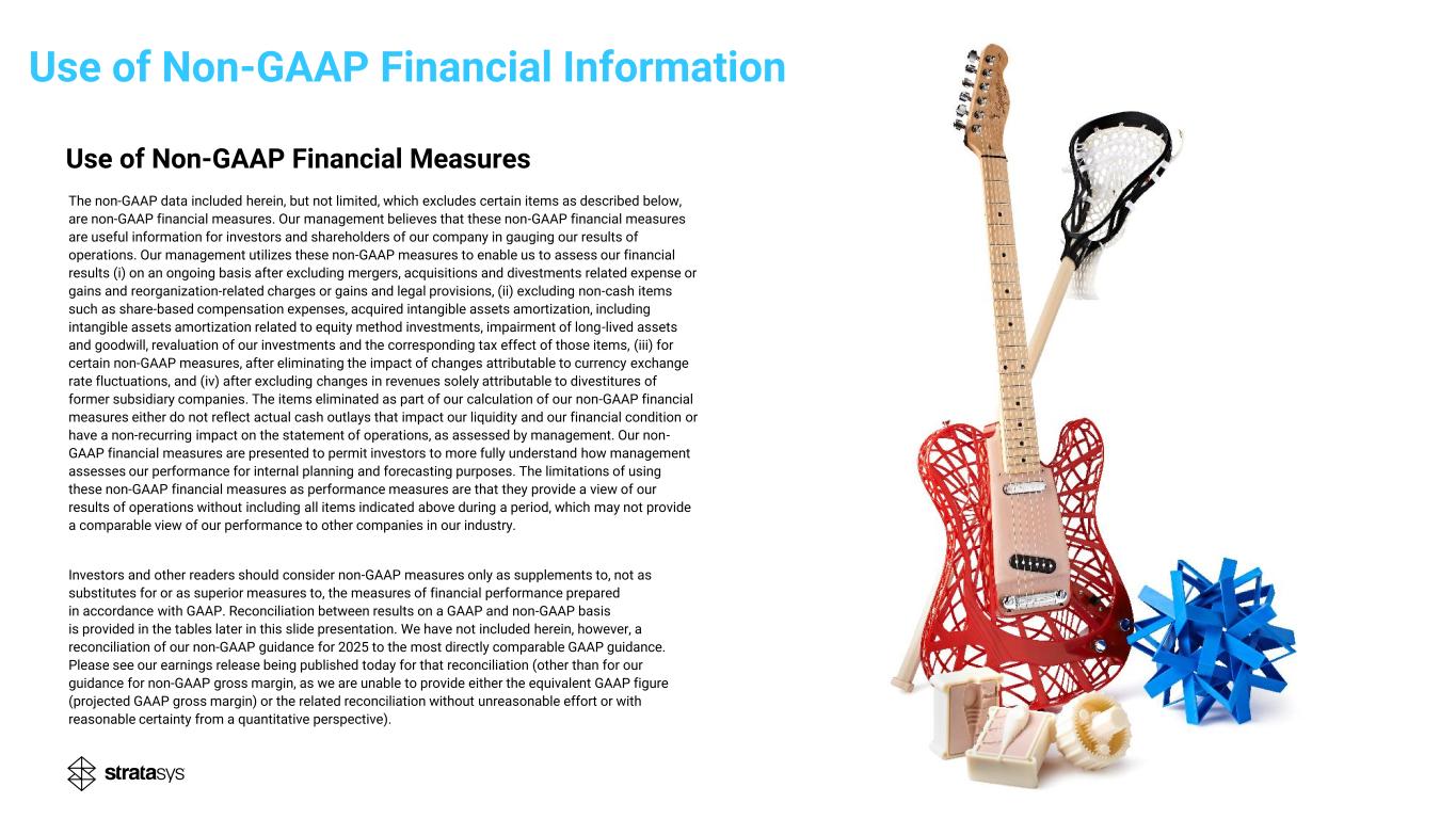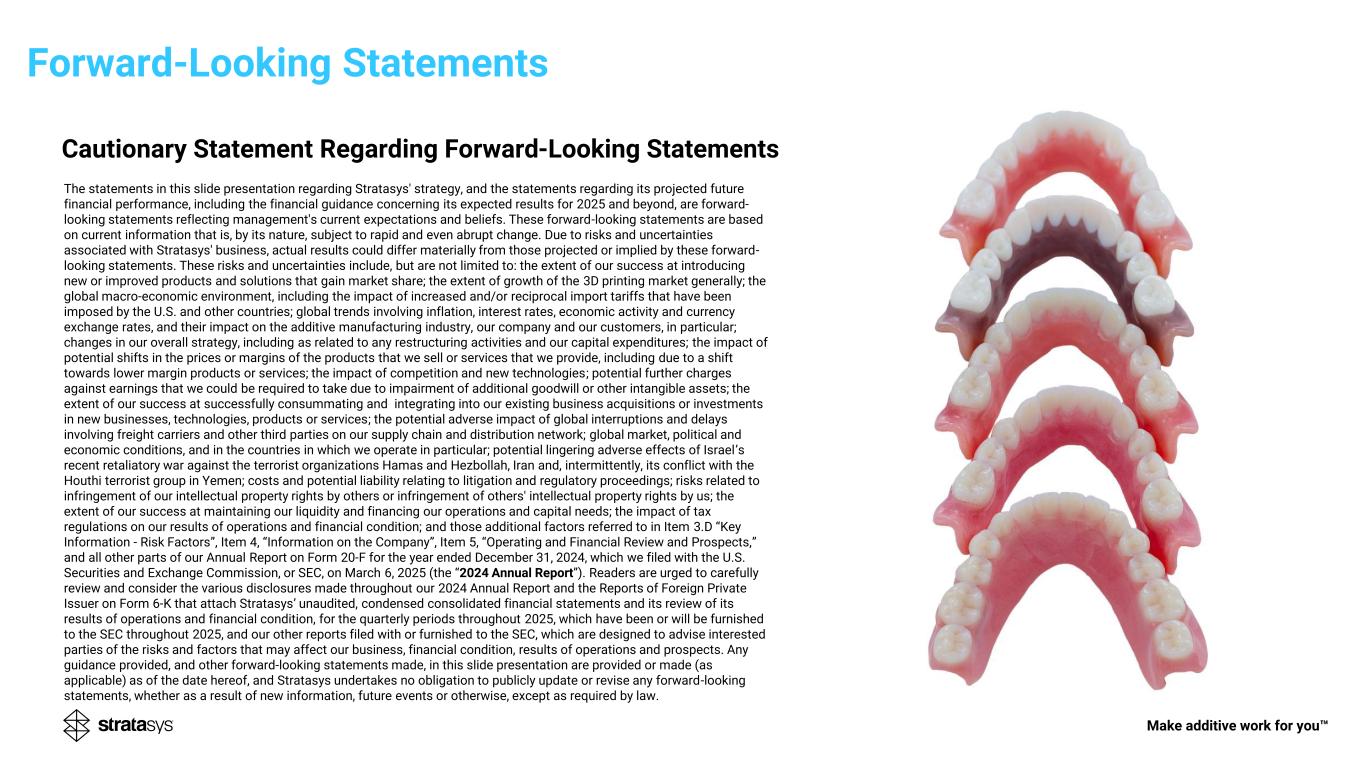 Forward-Looking Statements Cautionary Statement Regarding Forward-Looking Statements The statements in this slide presentation regarding Stratasys' strategy, and the statements regarding its projected future financial performance, including the financial guidance concerning its expected results for 2025 and beyond, are forward- looking statements reflecting management's current expectations and beliefs. These forward-looking statements are based on current information that is, by its nature, subject to rapid and even abrupt change. Due to risks and uncertainties associated with Stratasys' business, actual results could differ materially from those projected or implied by these forward- looking statements. These risks and uncertainties include, but are not limited to: the extent of our success at introducing new or improved products and solutions that gain market share; the extent of growth of the 3D printing market generally; the global macro-economic environment, including the impact of increased and/or reciprocal import tariffs that have been imposed by the U.S. and other countries; global trends involving inflation, interest rates, economic activity and currency exchange rates, and their impact on the additive manufacturing industry, our company and our customers, in particular; changes in our overall strategy, including as related to any restructuring activities and our capital expenditures; the impact of potential shifts in the prices or margins of the products that we sell or services that we provide, including due to a shift towards lower margin products or services; the impact of competition and new technologies; potential further charges against earnings that we could be required to take due to impairment of additional goodwill or other intangible assets; the extent of our success at successfully consummating and integrating into our existing business acquisitions or investments in new businesses, technologies, products or services; the potential adverse impact of global interruptions and delays involving freight carriers and other third parties on our supply chain and distribution network; global market, political and economic conditions, and in the countries in which we operate in particular; potential lingering adverse effects of Israel’s recent retaliatory war against the terrorist organizations Hamas and Hezbollah, Iran and, intermittently, its conflict with the Houthi terrorist group in Yemen; costs and potential liability relating to litigation and regulatory proceedings; risks related to infringement of our intellectual property rights by others or infringement of others' intellectual property rights by us; the extent of our success at maintaining our liquidity and financing our operations and capital needs; the impact of tax regulations on our results of operations and financial condition; and those additional factors referred to in Item 3.D “Key Information - Risk Factors”, Item 4, “Information on the Company”, Item 5, “Operating and Financial Review and Prospects,” and all other parts of our Annual Report on Form 20-F for the year ended December 31, 2024, which we filed with the U.S. Securities and Exchange Commission, or SEC, on March 6, 2025 (the “2024 Annual Report”). Readers are urged to carefully review and consider the various disclosures made throughout our 2024 Annual Report and the Reports of Foreign Private Issuer on Form 6-K that attach Stratasys’ unaudited, condensed consolidated financial statements and its review of its results of operations and financial condition, for the quarterly periods throughout 2025, which have been or will be furnished to the SEC throughout 2025, and our other reports filed with or furnished to the SEC, which are designed to advise interested parties of the risks and factors that may affect our business, financial condition, results of operations and prospects. Any guidance provided, and other forward-looking statements made, in this slide presentation are provided or made (as applicable) as of the date hereof, and Stratasys undertakes no obligation to publicly update or revise any forward-looking statements, whether as a result of new information, future events or otherwise, except as required by law. Make additive work for you
