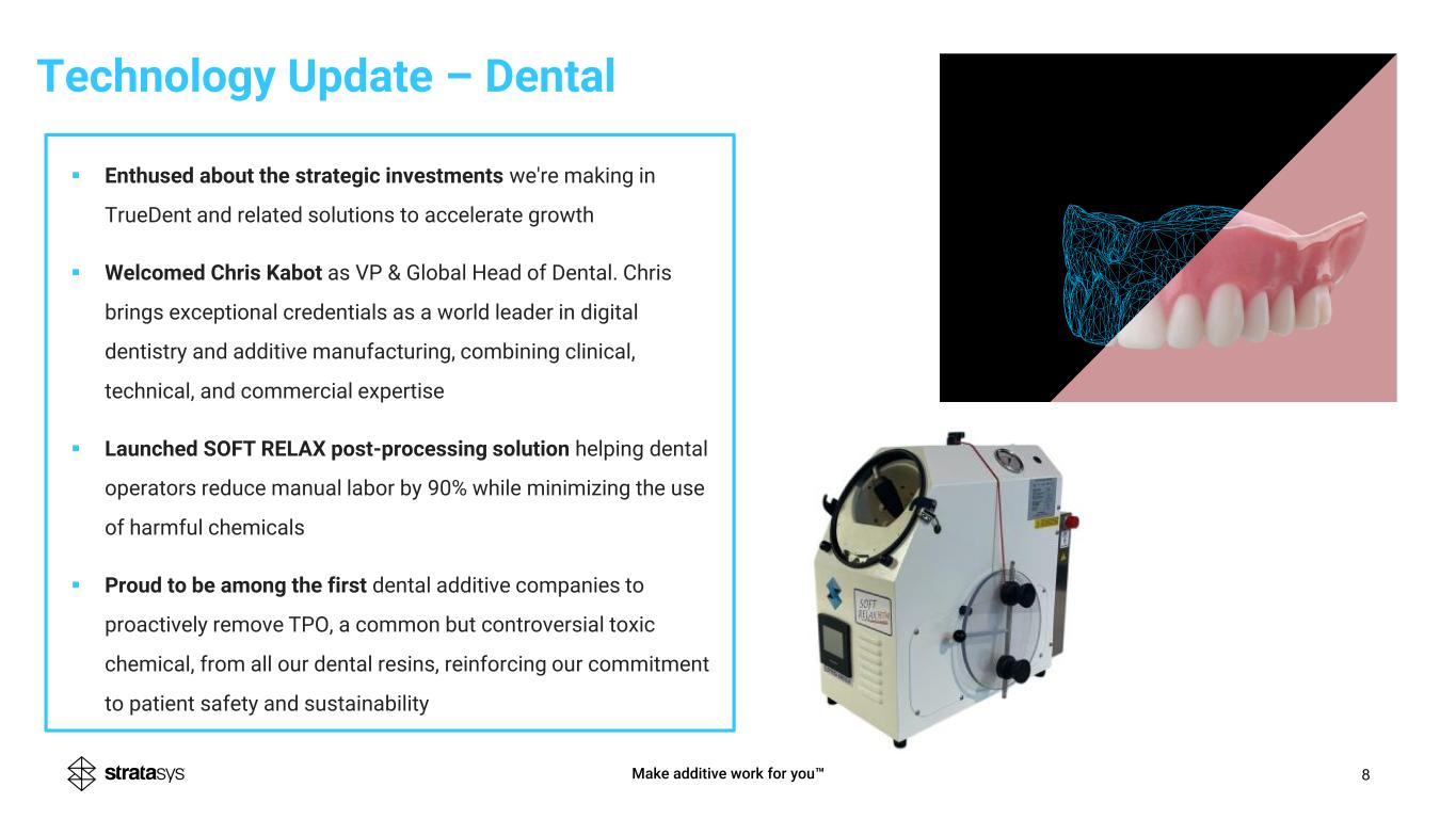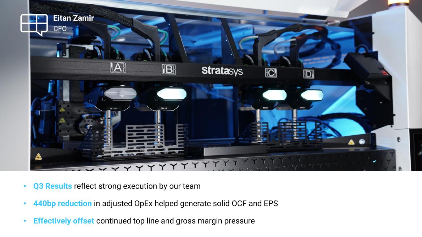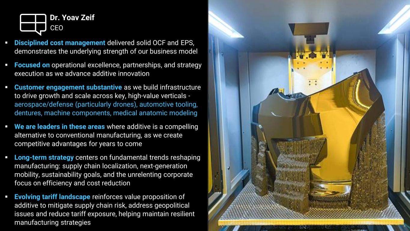 ▪ Disciplined cost management delivered solid OCF and EPS, demonstrates the underlying strength of our business model ▪ Focused on operational excellence, partnerships, and strategy execution as we advance additive innovation ▪ Customer engagement substantive as we build infrastructure to drive growth and scale across key, high-value verticals - aerospace/defense (particularly drones), automotive tooling, dentures, machine components, medical anatomic modeling ▪ We are leaders in these areas where additive is a compelling alternative to conventional manufacturing, as we create competitive advantages for years to come ▪ Long-term strategy centers on fundamental trends reshaping manufacturing: supply chain localization, next-generation mobility, sustainability goals, and the unrelenting corporate focus on efficiency and cost reduction ▪ Evolving tariff landscape reinforces value proposition of additive to mitigate supply chain risk, address geopolitical issues and reduce tariff exposure, helping maintain resilient manufacturing strategies CEO Dr. Yoav Zeif