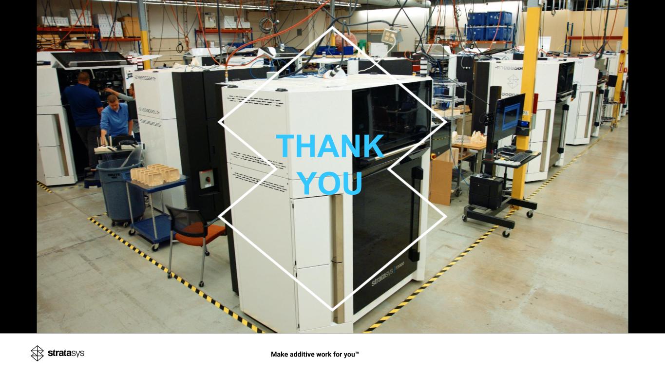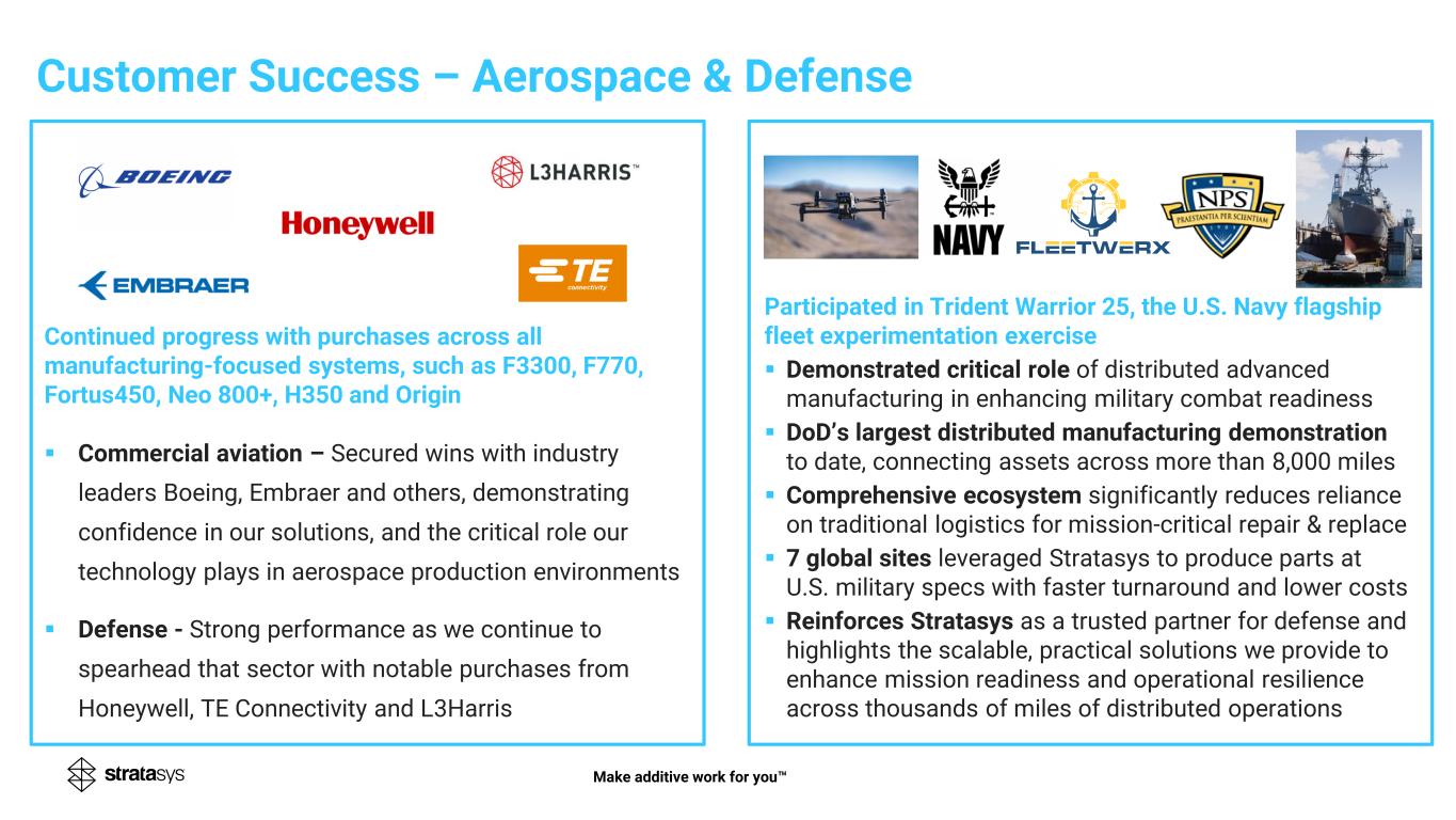 Customer Success – Aerospace & Defense Make additive work for you Continued progress with purchases across all manufacturing-focused systems, such as F3300, F770, Fortus450, Neo 800+, H350 and Origin ▪ Commercial aviation – Secured wins with industry leaders Boeing, Embraer and others, demonstrating confidence in our solutions, and the critical role our technology plays in aerospace production environments ▪ Defense - Strong performance as we continue to spearhead that sector with notable purchases from Honeywell, TE Connectivity and L3Harris Participated in Trident Warrior 25, the U.S. Navy flagship fleet experimentation exercise ▪ Demonstrated critical role of distributed advanced manufacturing in enhancing military combat readiness ▪ DoD’s largest distributed manufacturing demonstration to date, connecting assets across more than 8,000 miles ▪ Comprehensive ecosystem significantly reduces reliance on traditional logistics for mission-critical repair & replace ▪ 7 global sites leveraged Stratasys to produce parts at U.S. military specs with faster turnaround and lower costs ▪ Reinforces Stratasys as a trusted partner for defense and highlights the scalable, practical solutions we provide to enhance mission readiness and operational resilience across thousands of miles of distributed operations