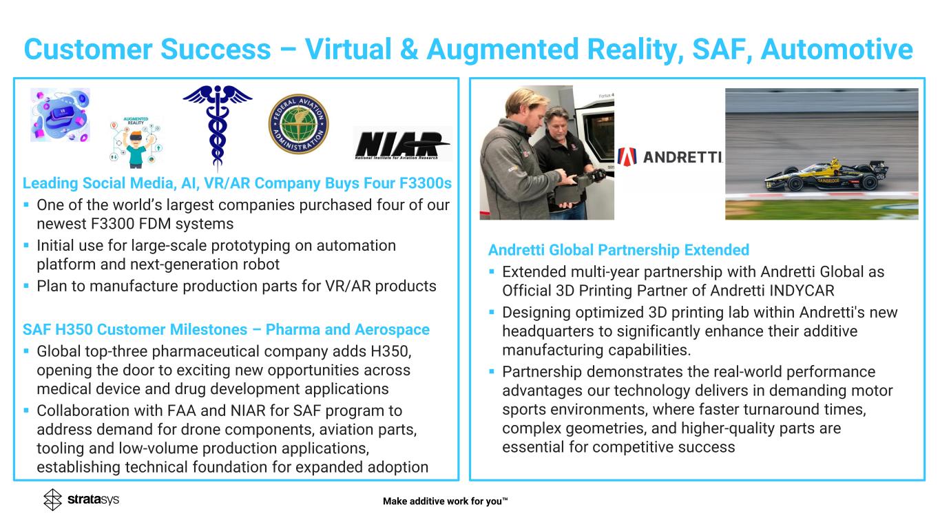 Customer Success – Virtual & Augmented Reality, SAF, Automotive Make additive work for you Leading Social Media, AI, VR/AR Company Buys Four F3300s ▪ One of the world’s largest companies purchased four of our newest F3300 FDM systems ▪ Initial use for large-scale prototyping on automation platform and next-generation robot ▪ Plan to manufacture production parts for VR/AR products SAF H350 Customer Milestones – Pharma and Aerospace ▪ Global top-three pharmaceutical company adds H350, opening the door to exciting new opportunities across medical device and drug development applications ▪ Collaboration with FAA and NIAR for SAF program to address demand for drone components, aviation parts, tooling and low-volume production applications, establishing technical foundation for expanded adoption Andretti Global Partnership Extended ▪ Extended multi-year partnership with Andretti Global as Official 3D Printing Partner of Andretti INDYCAR ▪ Designing optimized 3D printing lab within Andretti's new headquarters to significantly enhance their additive manufacturing capabilities. ▪ Partnership demonstrates the real-world performance advantages our technology delivers in demanding motor sports environments, where faster turnaround times, complex geometries, and higher-quality parts are essential for competitive success