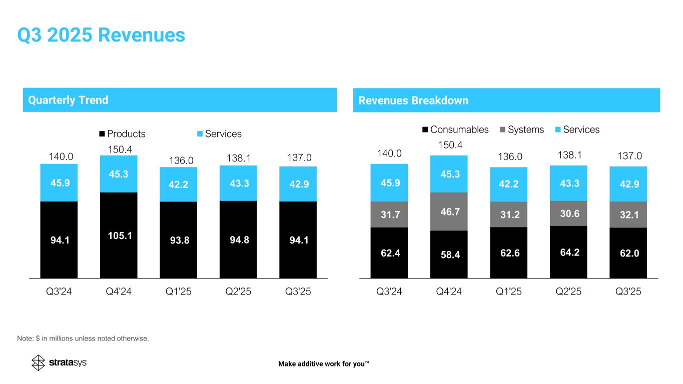 Quarterly Trend Make additive work for you Revenues Breakdown Note: $ in millions unless noted otherwise. 62.4 58.4 62.6 64.2 62.0 31.7 46.7 31.2 30.6 32.1 45.9 45.3 42.2 43.3 42.9 140.0 150.4 136.0 138.1 137.0 Q3'24 Q4'24 Q1'25 Q2'25 Q3'25 Consumables Systems Services 94.1 105.1 93.8 94.8 94.1 45.9 45.3 42.2 43.3 42.9 140.0 150.4 136.0 138.1 137.0 Q3'24 Q4'24 Q1'25 Q2'25 Q3'25 Products Services Q3 2025 Revenues
