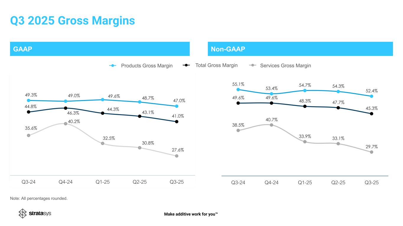 GAAP Non-GAAP 47.4% 47.2% 49.8% 50.0% 49.3% 24.4% 38.4% 32.2% 30.7% 35.6% 40.5% 44.6% 44.4% 43.8% 44.8% Q3-23 Q4-23 Q1-24 Q2-24 Q3-24 49.6% 49.6% 48.3% 47.7% 45.3% 55.1% 53.4% 54.7% 54.3% 52.4% 38.5% 40.7% 33.9% 33.1% 29.7% Q3-24 Q4-24 Q1-25 Q2-25 Q3-25 Services Gross MarginProducts Gross Margin Total Gross Margin Make additive work for you . . . . . . . . . . . . . . . - - - - - 47.4% 47.2% 49.8% 50.0% 49.3% 24.4% 38.4% 32.2% 30.7% 35.6% 40.5% 44.6% 44.4% 43.8% 44.8% Q3-23 Q4-23 Q1-24 Q2-24 Q3-24 49.3% 49.0% 49.6% 48.7% 47.0% 35.6% 40.2% 32.5% 30.8% 27.6% 44.8% 46.3% 44.3% 43.1% 41.0% Q3-24 Q4-24 Q1-25 Q2-25 Q3-25 Note: All percentages rounded. Q3 2025 Gross Margins