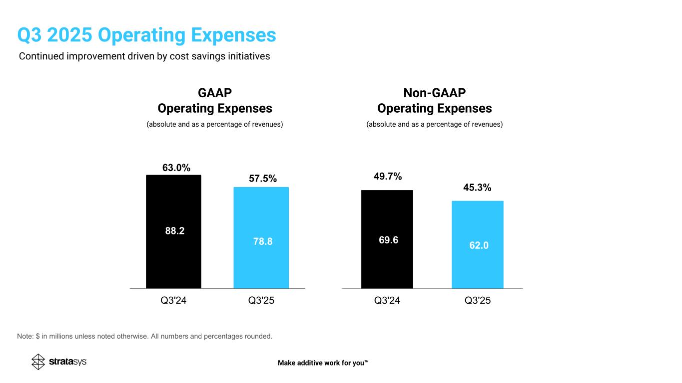 GAAP Operating Expenses (absolute and as a percentage of revenues) Non-GAAP Operating Expenses (absolute and as a percentage of revenues) 88.2 78.8 57.5% Q3'24 Q3'25 63.0% 69.6 62.0 Q3'24 Q3'25 45.3%41.0% 49.7% Continued improvement driven by cost savings initiatives Note: $ in millions unless noted otherwise. All numbers and percentages rounded. Q3 2025 Operating Expenses Make additive work for you
