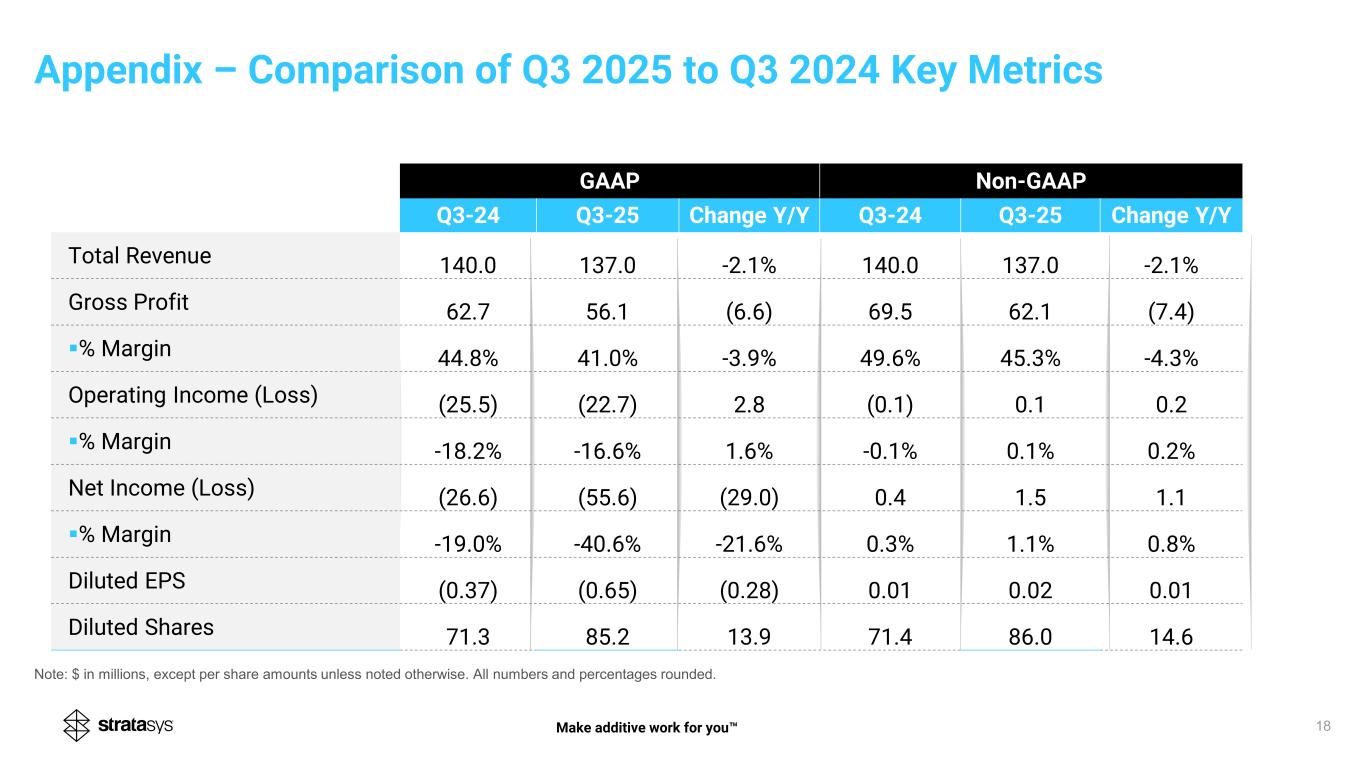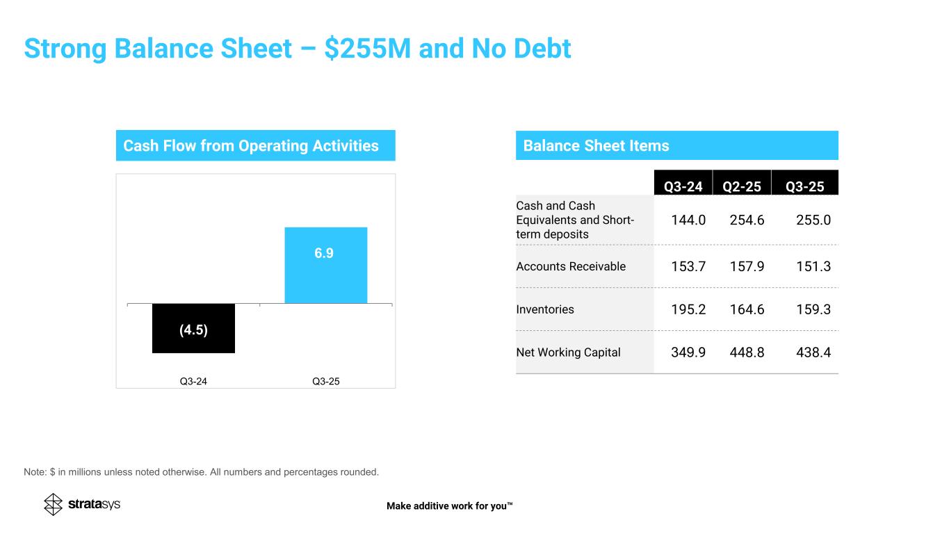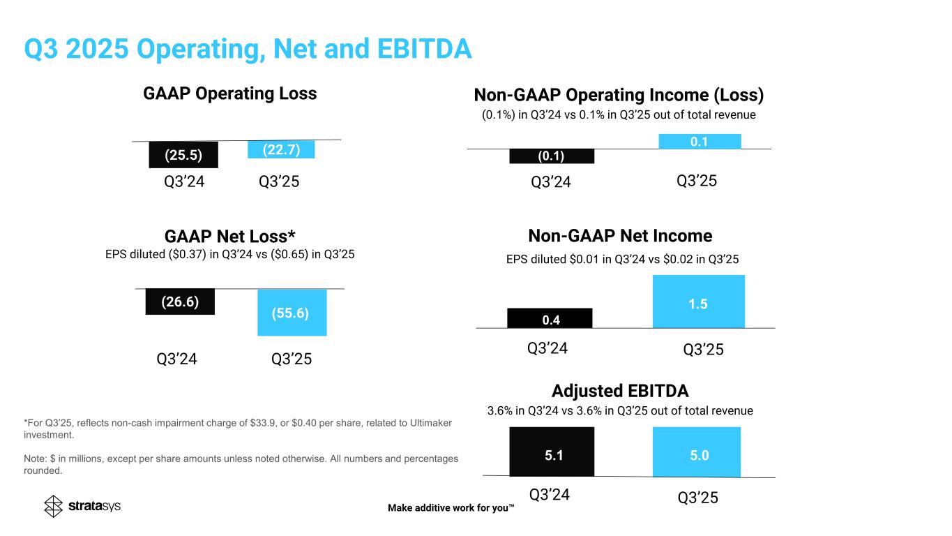 (26.6) )55.6( (22.7) Non-GAAP Operating Income (Loss) (0.1%) in Q3’24 vs 0.1% in Q3’25 out of total revenue GAAP Operating Loss Non-GAAP Net Income EPS diluted $0.01 in Q3’24 vs $0.02 in Q3’25 GAAP Net Loss* EPS diluted ($0.37) in Q3’24 vs ($0.65) in Q3’25 Q3’24 Q3’25 5.05.1 1.5 Adjusted EBITDA 3.6% in Q3’24 vs 3.6% in Q3’25 out of total revenue (0.1) 0.1 0.4 Q3’24 Q3’25 Q3’24 Q3’25 Q3’24 Q3’25 Q3’24 Q3’25 (25.5) Q3 2025 Operating, Net and EBITDA *For Q3’25, reflects non-cash impairment charge of $33.9, or $0.40 per share, related to Ultimaker investment. Note: $ in millions, except per share amounts unless noted otherwise. All numbers and percentages rounded. Make additive work for you