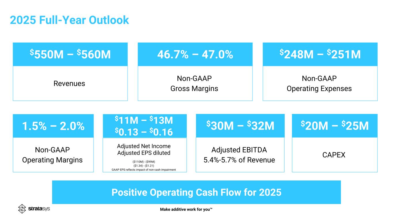 Revenues Non-GAAP Gross Margins Non-GAAP Operating Expenses Non-GAAP Operating Margins Adjusted Net Income Adjusted EPS diluted ($110M) - ($99M) ($1.34) - ($1.21) GAAP EPS reflects impact of non-cash impairment CAPEX Adjusted EBITDA 5.4%-5.7% of Revenue $550M – $560M 46.7% – 47.0% $248M – $251M $20M – $25M$30M – $32M1.5% – 2.0% Positive Operating Cash Flow for 2025 2025 Full-Year Outlook $11M – $13M $0.13 – $0.16 Make additive work for you