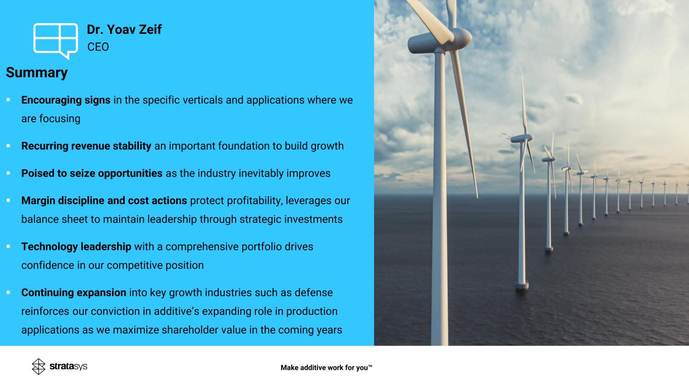 CEO Dr. Yoav Zeif Summary ▪ Encouraging signs in the specific verticals and applications where we are focusing ▪ Recurring revenue stability an important foundation to build growth ▪ Poised to seize opportunities as the industry inevitably improves ▪ Margin discipline and cost actions protect profitability, leverages our balance sheet to maintain leadership through strategic investments ▪ Technology leadership with a comprehensive portfolio drives confidence in our competitive position ▪ Continuing expansion into key growth industries such as defense reinforces our conviction in additive’s expanding role in production applications as we maximize shareholder value in the coming years Make additive work for you