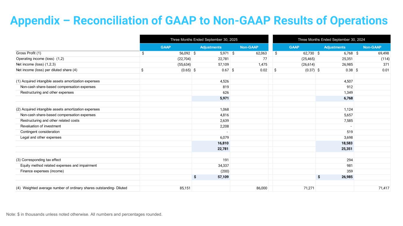 Note: $ in thousands unless noted otherwise. All numbers and percentages rounded. Appendix – Reconciliation of GAAP to Non-GAAP Results of Operations GAAP Adjustments Non-GAAP GAAP Adjustments Non-GAAP Gross Profit (1) $ 56,092 $ 5,971 $ 62,063 $ 62,730 $ 6,768 $ 69,498 Operating income (loss) (1,2) (22,704) 22,781 77 (25,465) 25,351 (114) Net income (loss) (1,2,3) (55,634) 57,109 1,475 (26,614) 26,985 371 Net income (loss) per diluted share (4) $ (0.65) $ 0.67 $ 0.02 $ (0.37) $ 0.38 $ 0.01 (1) Acquired intangible assets amortization expenses 4,526 4,507 Non-cash share-based compensation expenses 819 912 Restructuring and other expenses 626 1,349 5,971 6,768 (2) Acquired intangible assets amortization expenses 1,068 1,124 Non-cash share-based compensation expenses 4,816 5,657 Restructuring and other related costs 2,639 7,585 Revaluation of investment 2,208 - Contingent consideration - 519 Legal and other expenses 6,079 3,698 16,810 18,583 22,781 25,351 (3) Corresponding tax effect 191 294 Equity method related expenses and impairment 34,337 981 Finance expenses (income) (200) 359 $ 57,109 $ 26,985 (4) Weighted average number of ordinary shares outstanding- Diluted 85,151 86,000 71,271 71,417 Three Months Ended September 30, 2025 Three Months Ended September 30, 2024