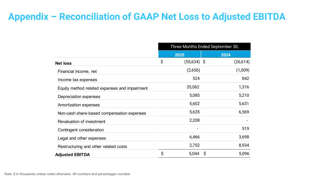 Note: $ in thousands unless noted otherwise. All numbers and percentages rounded. Appendix – Reconciliation of GAAP Net Loss to Adjusted EBITDA 2025 2024 Net loss $ (55,634) $ (26,614) Financial income, net (2,656) (1,009) Income tax expenses 524 842 Equity method related expenses and impairment 35,062 1,316 Depreciation expenses 5,085 5,210 Amortization expenses 5,602 5,631 Non-cash share-based compensation expenses 5,635 6,569 Revaluation of investment 2,208 - Contingent consideration - 519 Legal and other expenses 6,466 3,698 Restructuring and other related costs 2,752 8,934 Adjusted EBITDA $ 5,044 $ 5,096 Three Months Ended September 30,