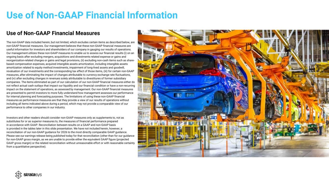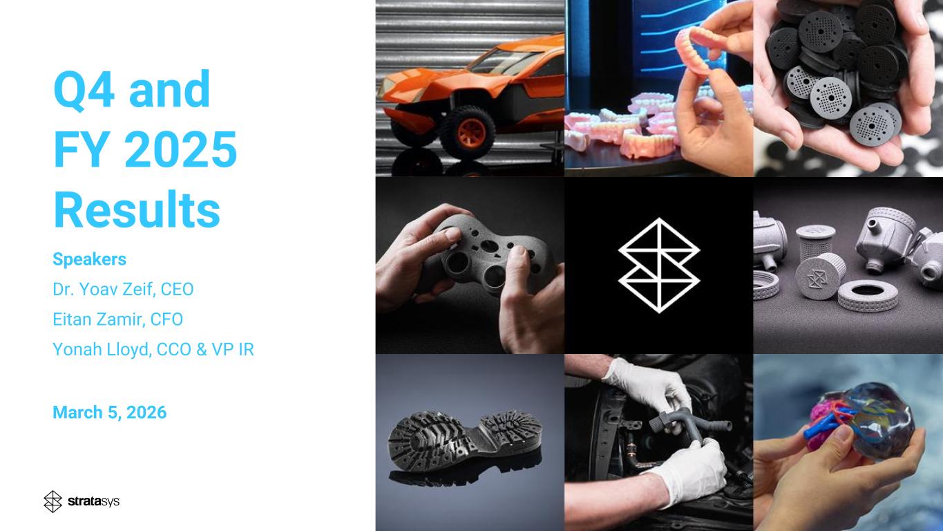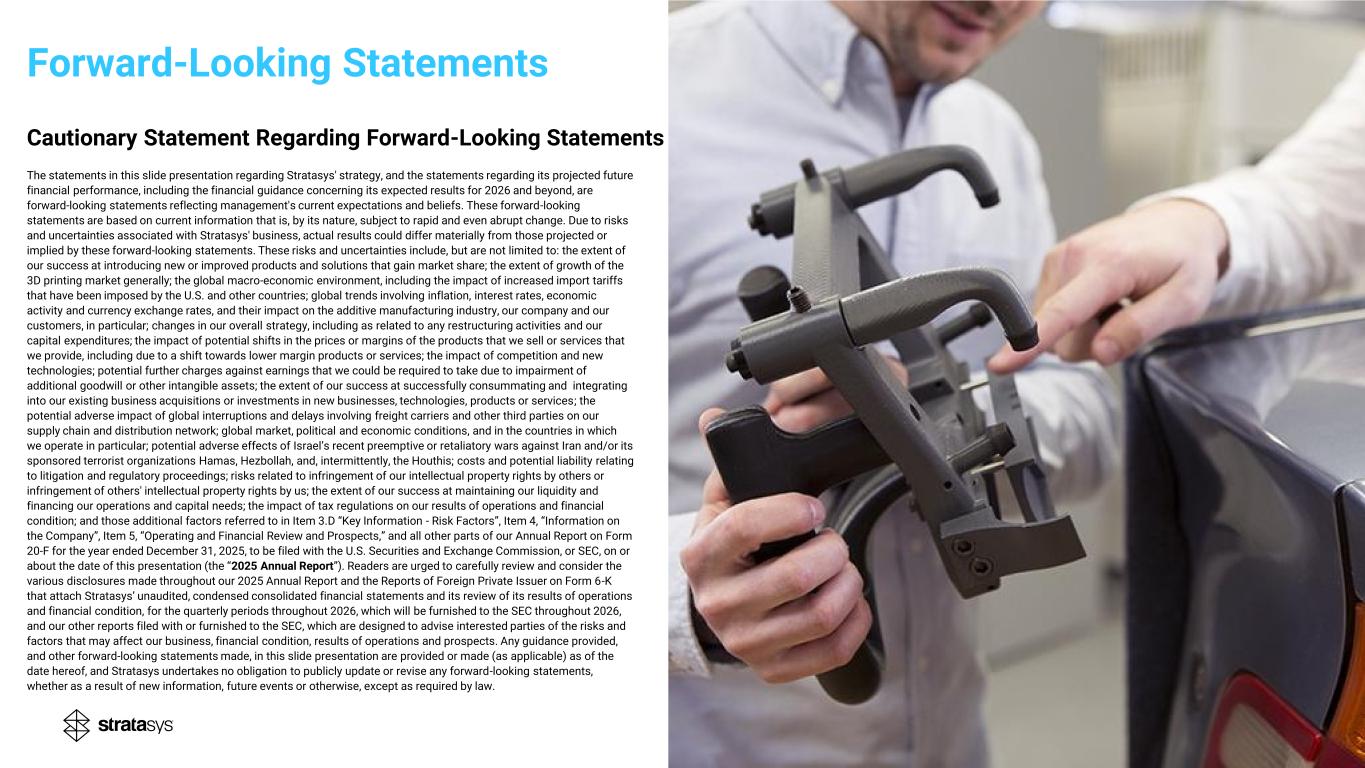 Forward-Looking Statements Cautionary Statement Regarding Forward-Looking Statements The statements in this slide presentation regarding Stratasys' strategy, and the statements regarding its projected future financial performance, including the financial guidance concerning its expected results for 2026 and beyond, are forward-looking statements reflecting management's current expectations and beliefs. These forward-looking statements are based on current information that is, by its nature, subject to rapid and even abrupt change. Due to risks and uncertainties associated with Stratasys' business, actual results could differ materially from those projected or implied by these forward-looking statements. These risks and uncertainties include, but are not limited to: the extent of our success at introducing new or improved products and solutions that gain market share; the extent of growth of the 3D printing market generally; the global macro-economic environment, including the impact of increased import tariffs that have been imposed by the U.S. and other countries; global trends involving inflation, interest rates, economic activity and currency exchange rates, and their impact on the additive manufacturing industry, our company and our customers, in particular; changes in our overall strategy, including as related to any restructuring activities and our capital expenditures; the impact of potential shifts in the prices or margins of the products that we sell or services that we provide, including due to a shift towards lower margin products or services; the impact of competition and new technologies; potential further charges against earnings that we could be required to take due to impairment of additional goodwill or other intangible assets; the extent of our success at successfully consummating and integrating into our existing business acquisitions or investments in new businesses, technologies, products or services; the potential adverse impact of global interruptions and delays involving freight carriers and other third parties on our supply chain and distribution network; global market, political and economic conditions, and in the countries in which we operate in particular; potential adverse effects of Israel’s recent preemptive or retaliatory wars against Iran and/or its sponsored terrorist organizations Hamas, Hezbollah, and, intermittently, the Houthis; costs and potential liability relating to litigation and regulatory proceedings; risks related to infringement of our intellectual property rights by others or infringement of others' intellectual property rights by us; the extent of our success at maintaining our liquidity and financing our operations and capital needs; the impact of tax regulations on our results of operations and financial condition; and those additional factors referred to in Item 3.D “Key Information - Risk Factors”, Item 4, “Information on the Company”, Item 5, “Operating and Financial Review and Prospects,” and all other parts of our Annual Report on Form 20-F for the year ended December 31, 2025, to be filed with the U.S. Securities and Exchange Commission, or SEC, on or about the date of this presentation (the “2025 Annual Report”). Readers are urged to carefully review and consider the various disclosures made throughout our 2025 Annual Report and the Reports of Foreign Private Issuer on Form 6-K that attach Stratasys’ unaudited, condensed consolidated financial statements and its review of its results of operations and financial condition, for the quarterly periods throughout 2026, which will be furnished to the SEC throughout 2026, and our other reports filed with or furnished to the SEC, which are designed to advise interested parties of the risks and factors that may affect our business, financial condition, results of operations and prospects. Any guidance provided, and other forward-looking statements made, in this slide presentation are provided or made (as applicable) as of the date hereof, and Stratasys undertakes no obligation to publicly update or revise any forward-looking statements, whether as a result of new information, future events or otherwise, except as required by law. Make additive work for you