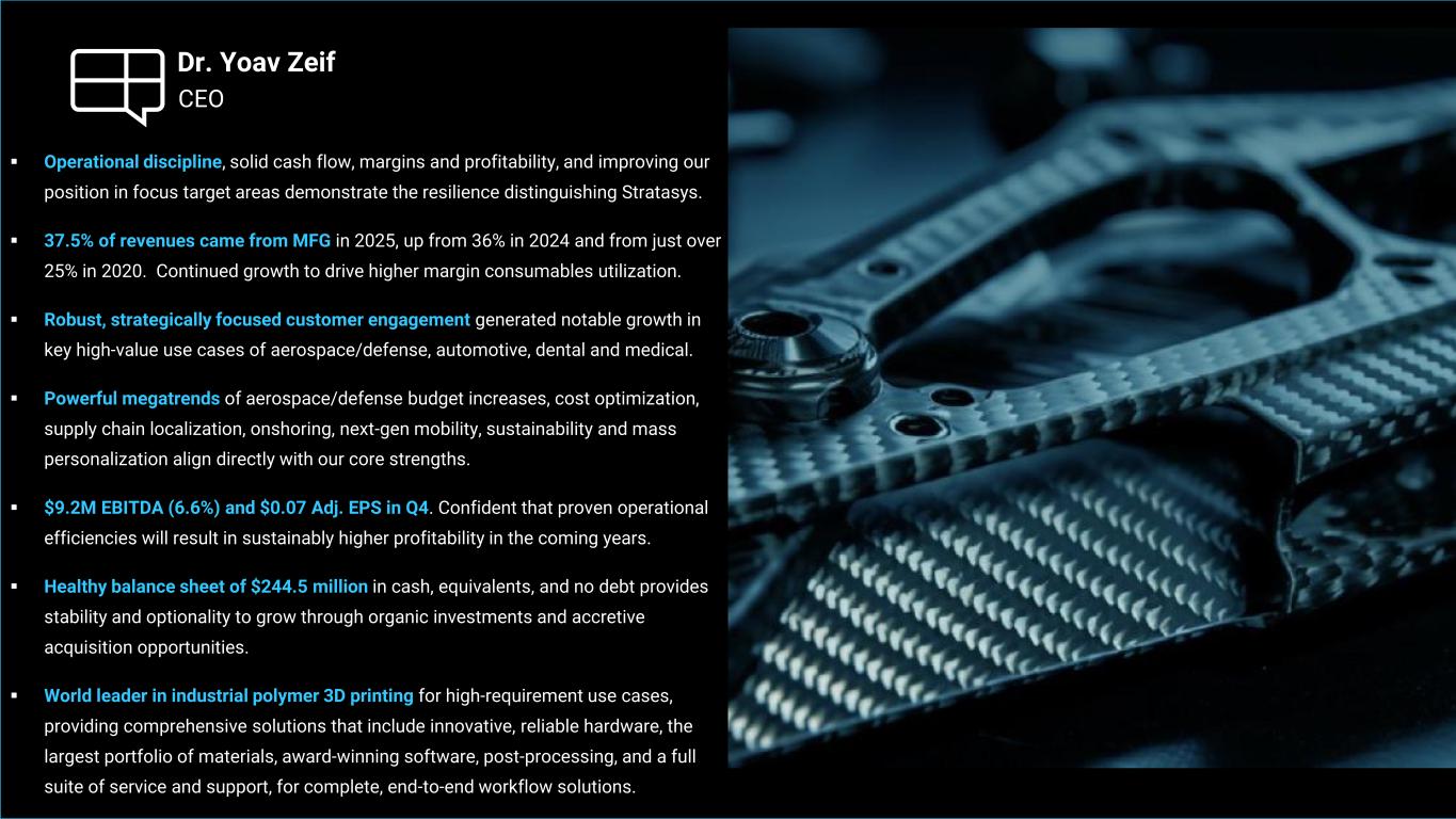 ▪ Operational discipline, solid cash flow, margins and profitability, and improving our position in focus target areas demonstrate the resilience distinguishing Stratasys. ▪ 37.5% of revenues came from MFG in 2025, up from 36% in 2024 and from just over 25% in 2020. Continued growth to drive higher margin consumables utilization. ▪ Robust, strategically focused customer engagement generated notable growth in key high-value use cases of aerospace/defense, automotive, dental and medical. ▪ Powerful megatrends of aerospace/defense budget increases, cost optimization, supply chain localization, onshoring, next-gen mobility, sustainability and mass personalization align directly with our core strengths. ▪ $9.2M EBITDA (6.6%) and $0.07 Adj. EPS in Q4. Confident that proven operational efficiencies will result in sustainably higher profitability in the coming years. ▪ Healthy balance sheet of $244.5 million in cash, equivalents, and no debt provides stability and optionality to grow through organic investments and accretive acquisition opportunities. ▪ World leader in industrial polymer 3D printing for high-requirement use cases, providing comprehensive solutions that include innovative, reliable hardware, the largest portfolio of materials, award-winning software, post-processing, and a full suite of service and support, for complete, end-to-end workflow solutions. CEO Dr. Yoav Zeif