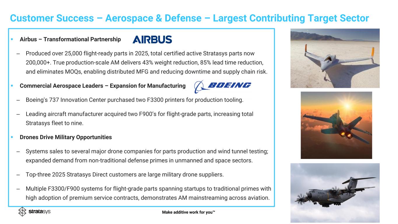 Customer Success – Aerospace & Defense – Largest Contributing Target Sector Make additive work for you ▪ Airbus – Transformational Partnership ‒ Produced over 25,000 flight-ready parts in 2025, total certified active Stratasys parts now 200,000+. True production-scale AM delivers 43% weight reduction, 85% lead time reduction, and eliminates MOQs, enabling distributed MFG and reducing downtime and supply chain risk. ▪ Commercial Aerospace Leaders – Expansion for Manufacturing ‒ Boeing's 737 Innovation Center purchased two F3300 printers for production tooling. ‒ Leading aircraft manufacturer acquired two F900’s for flight-grade parts, increasing total Stratasys fleet to nine. ▪ Drones Drive Military Opportunities ‒ Systems sales to several major drone companies for parts production and wind tunnel testing; expanded demand from non-traditional defense primes in unmanned and space sectors. ‒ Top-three 2025 Stratasys Direct customers are large military drone suppliers. ‒ Multiple F3300/F900 systems for flight-grade parts spanning startups to traditional primes with high adoption of premium service contracts, demonstrates AM mainstreaming across aviation.