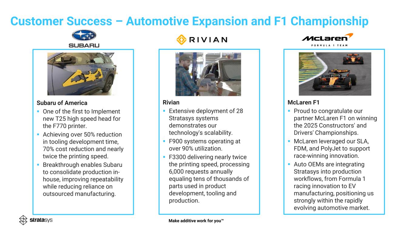 Make additive work for you Subaru of America ▪ One of the first to Implement new T25 high speed head for the F770 printer. ▪ Achieving over 50% reduction in tooling development time, 70% cost reduction and nearly twice the printing speed. ▪ Breakthrough enables Subaru to consolidate production in- house, improving repeatability while reducing reliance on outsourced manufacturing. Customer Success – Automotive Expansion and F1 Championship Rivian ▪ Extensive deployment of 28 Stratasys systems demonstrates our technology's scalability. ▪ F900 systems operating at over 90% utilization. ▪ F3300 delivering nearly twice the printing speed, processing 6,000 requests annually equaling tens of thousands of parts used in product development, tooling and production. McLaren F1 ▪ Proud to congratulate our partner McLaren F1 on winning the 2025 Constructors' and Drivers' Championships. ▪ McLaren leveraged our SLA, FDM, and PolyJet to support race-winning innovation. ▪ Auto OEMs are integrating Stratasys into production workflows, from Formula 1 racing innovation to EV manufacturing, positioning us strongly within the rapidly evolving automotive market.